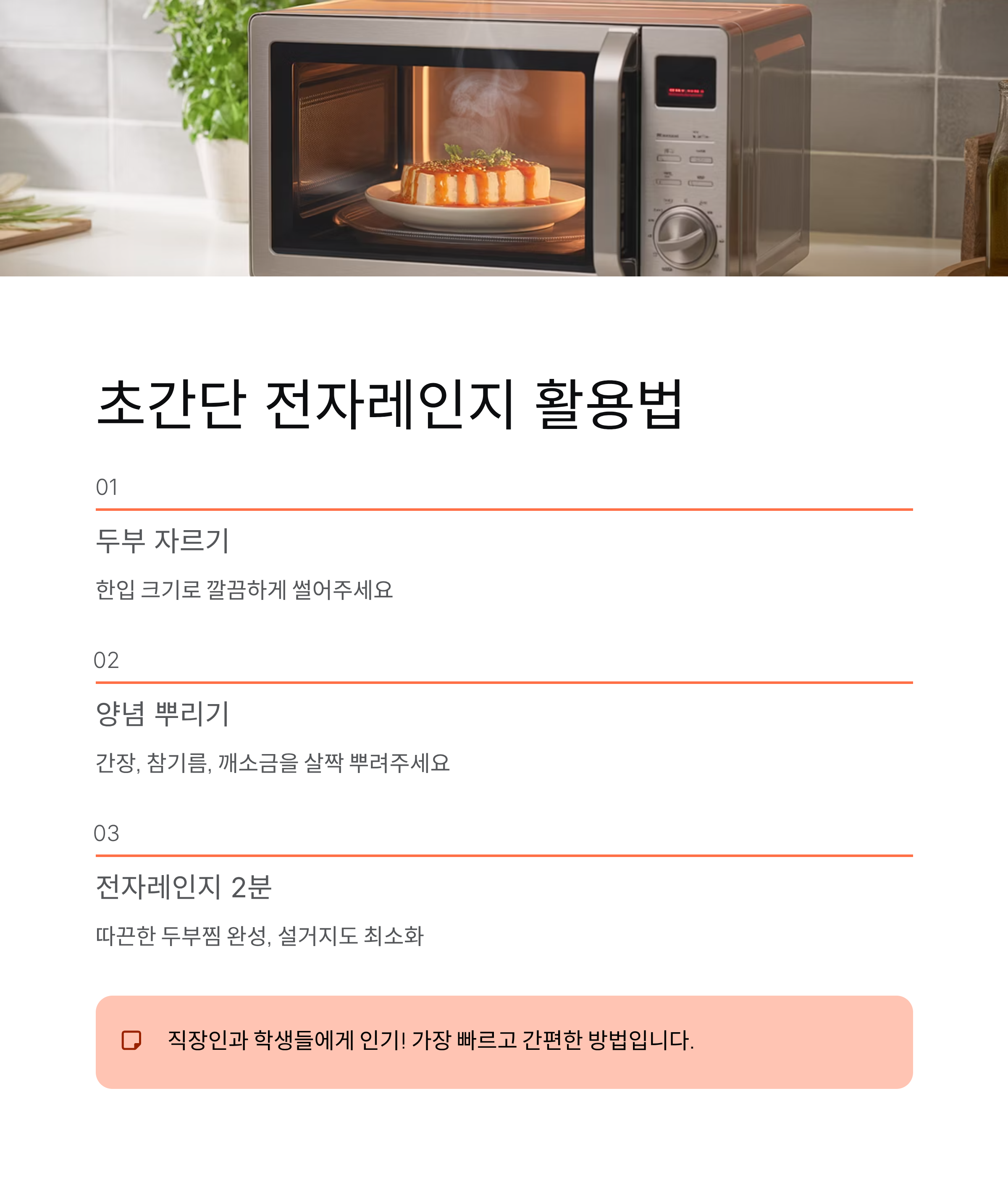| 전자레인지 두부찜 | 약 3분 | 초간단, 설거지 최소화 |