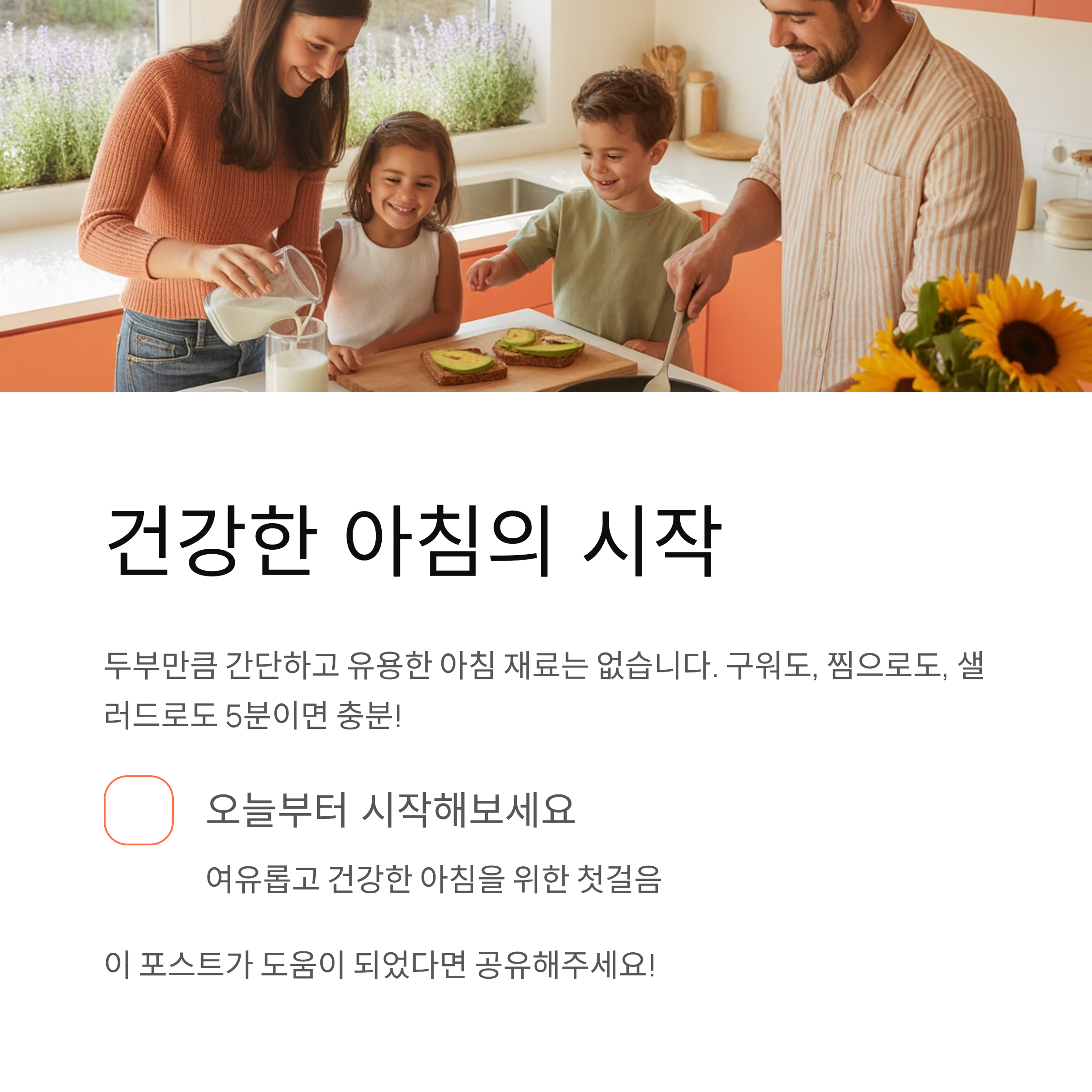 오늘 소개한 두부요리 팁을 활용해 아침 시간을 여유롭고 건강하게 시작해 보세요.