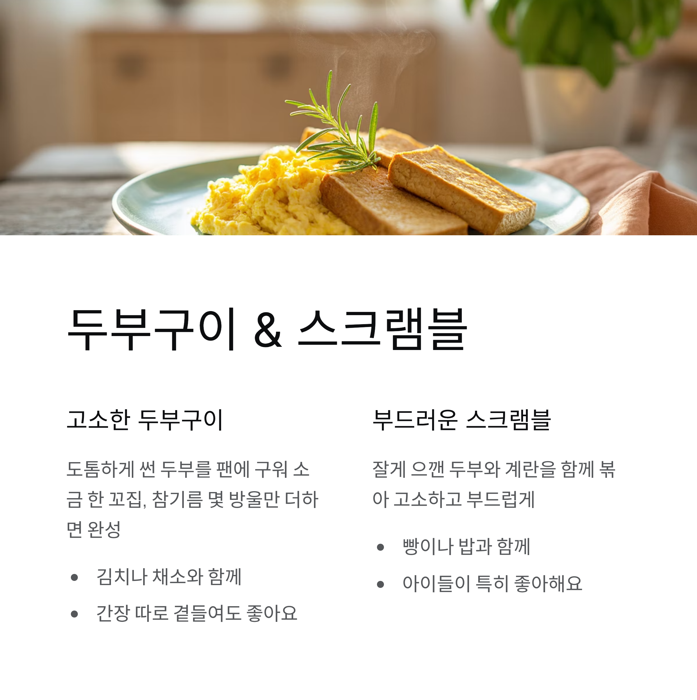 | 두부계란 스크램블 | 약 5분 | 아이들이 좋아하는 부드러운 식감 |