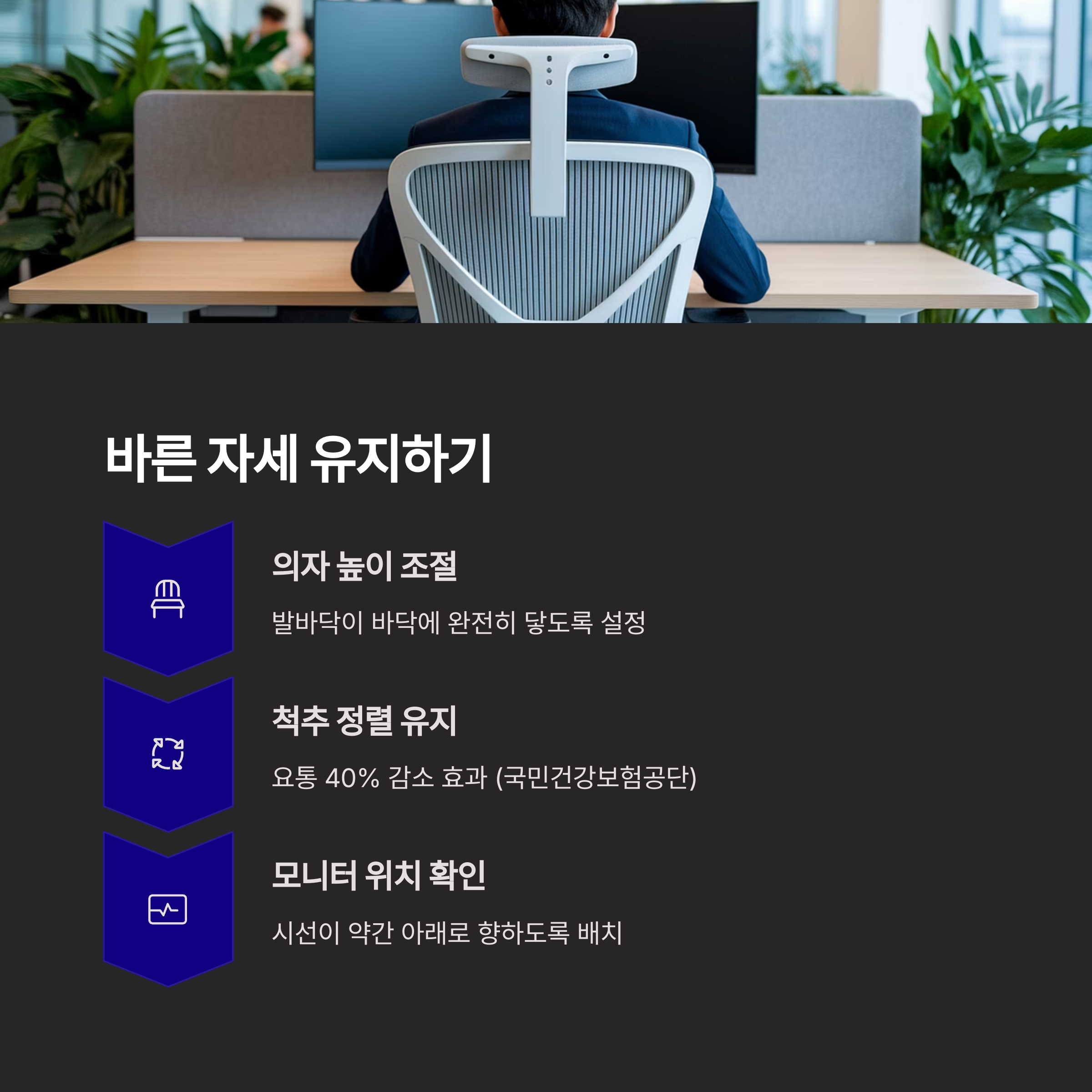 가장 손쉬운 건강 습관은 자세 바르게 앉기입니다. 화면을 볼 때 목을 앞으로 내밀지 않고, 허리를 등받이에 붙여 정자세를 유지하면 허리 통증과 눈 피로를 줄일 수 있어요. 또, 1시간마다 1분 스트레칭을 실천하면 근육의 긴장을 풀고 혈액순환에도 도움이 됩니다. 짧은 시간의 움직임이 집중력 향상에도 큰 영향을 미칩니다.