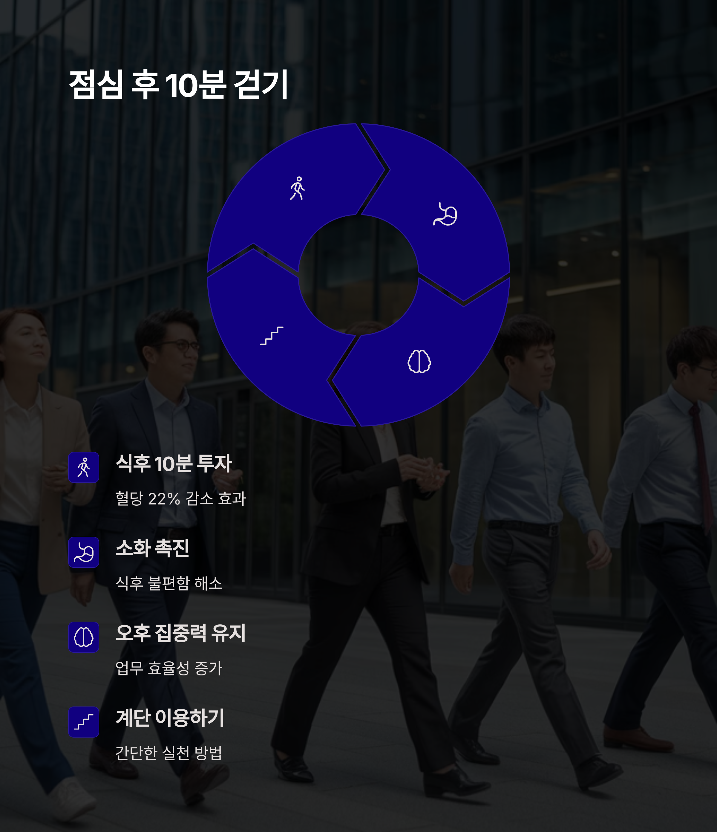 | 직장인 맞춤 루틴 | 알람 설정으로 스트레칭, 점심시간 산책, 계단 이용하기 등을 실천해보세요. |