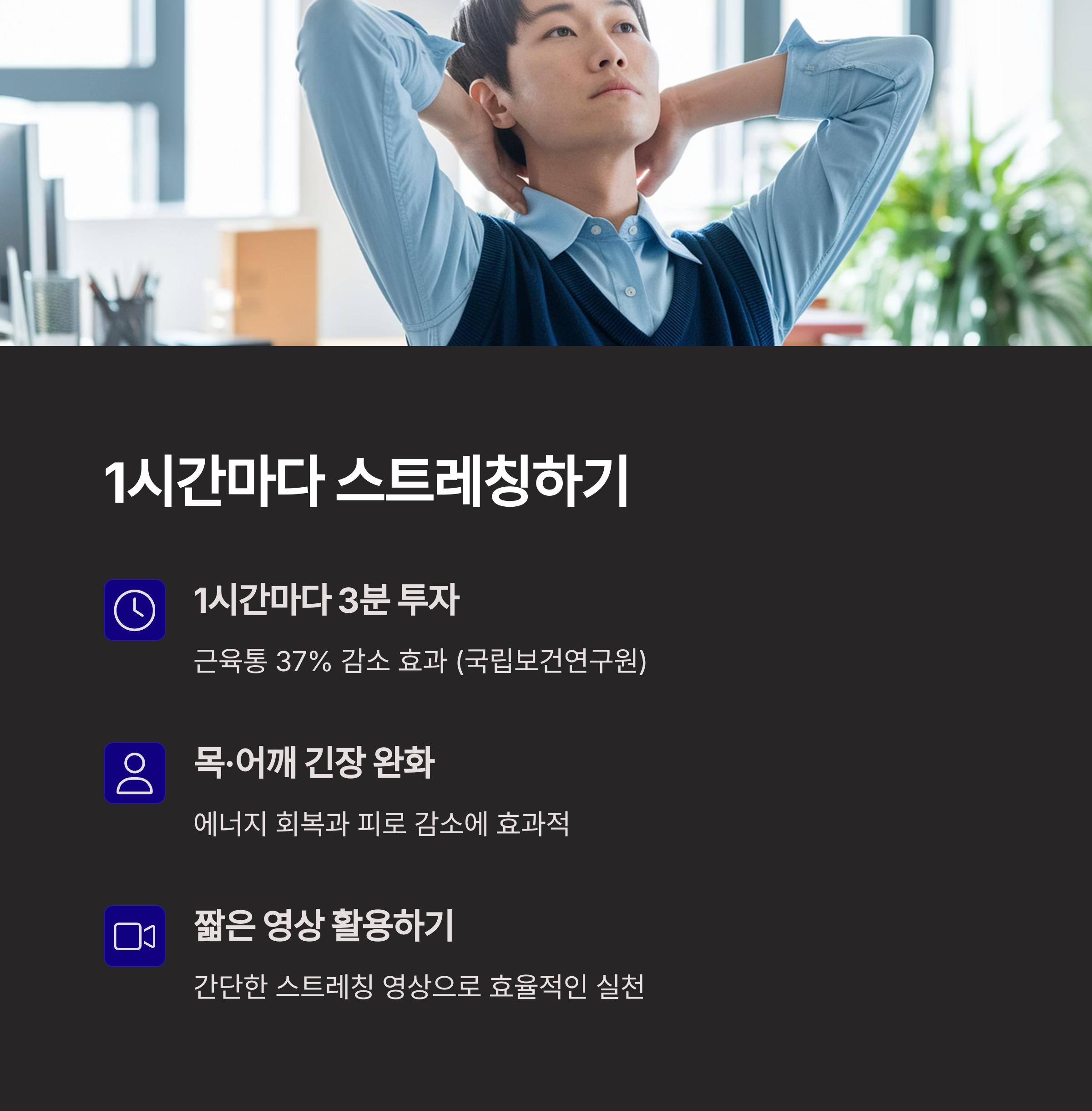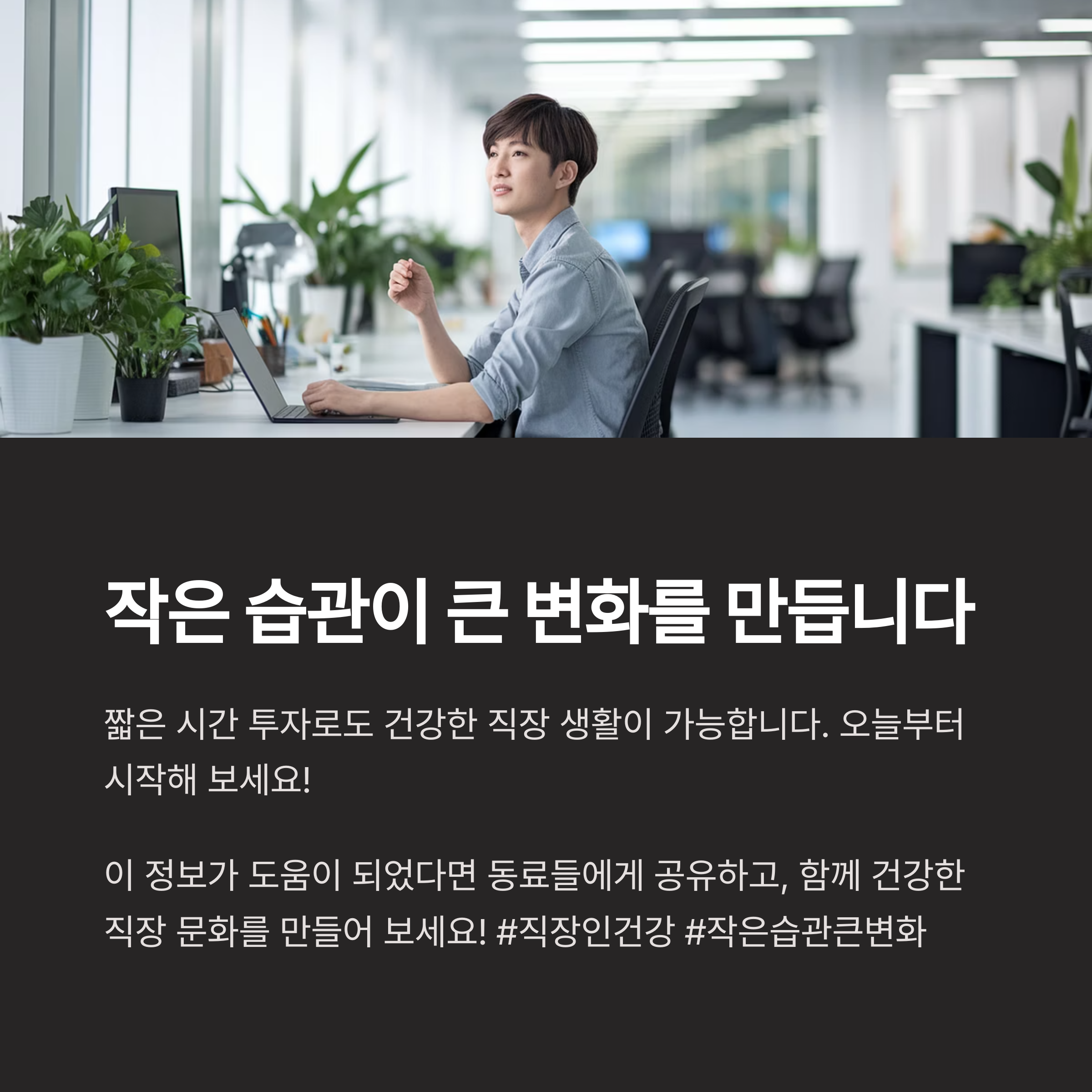 앉은 자세, 스트레칭 타이밍, 수분 섭취 노하우 등 직장인으로서 실천 중인 건강 루틴을 댓글로 알려주세요. 함께 공유하면 더 많은 분들께 도움이 될 거예요!
