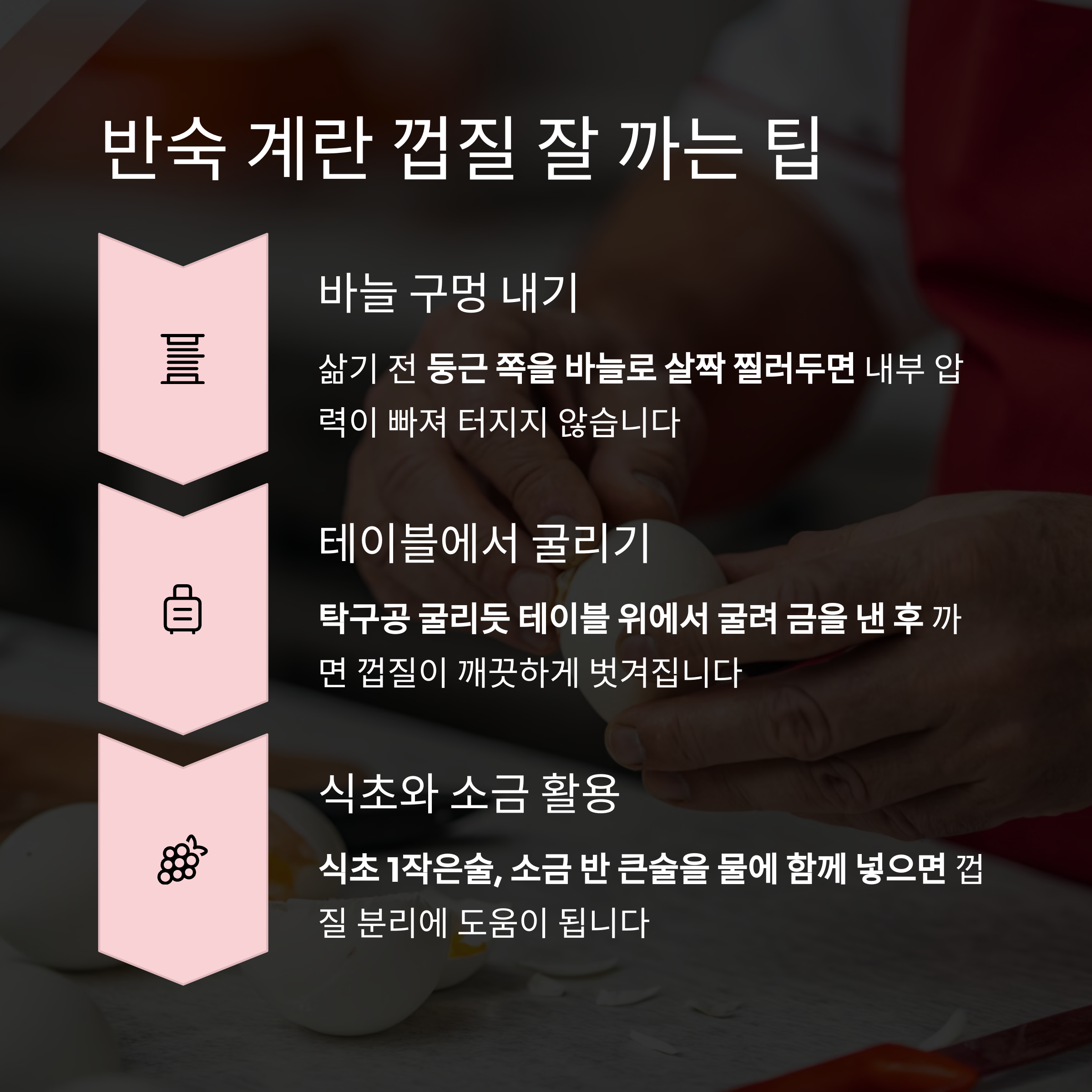 - 식초 1작은술, 소금 반 큰술을 물에 함께 넣으면 껍질 분리 도움