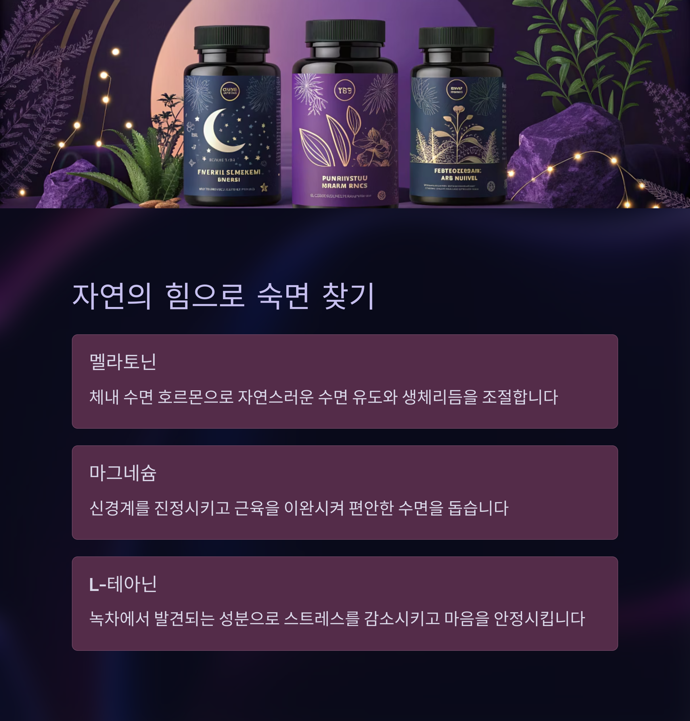 | 천연 성분 기반 수면 보조 | 수면 리듬 조절에 효과적 | 신경 안정 및 스트레스 완화 |