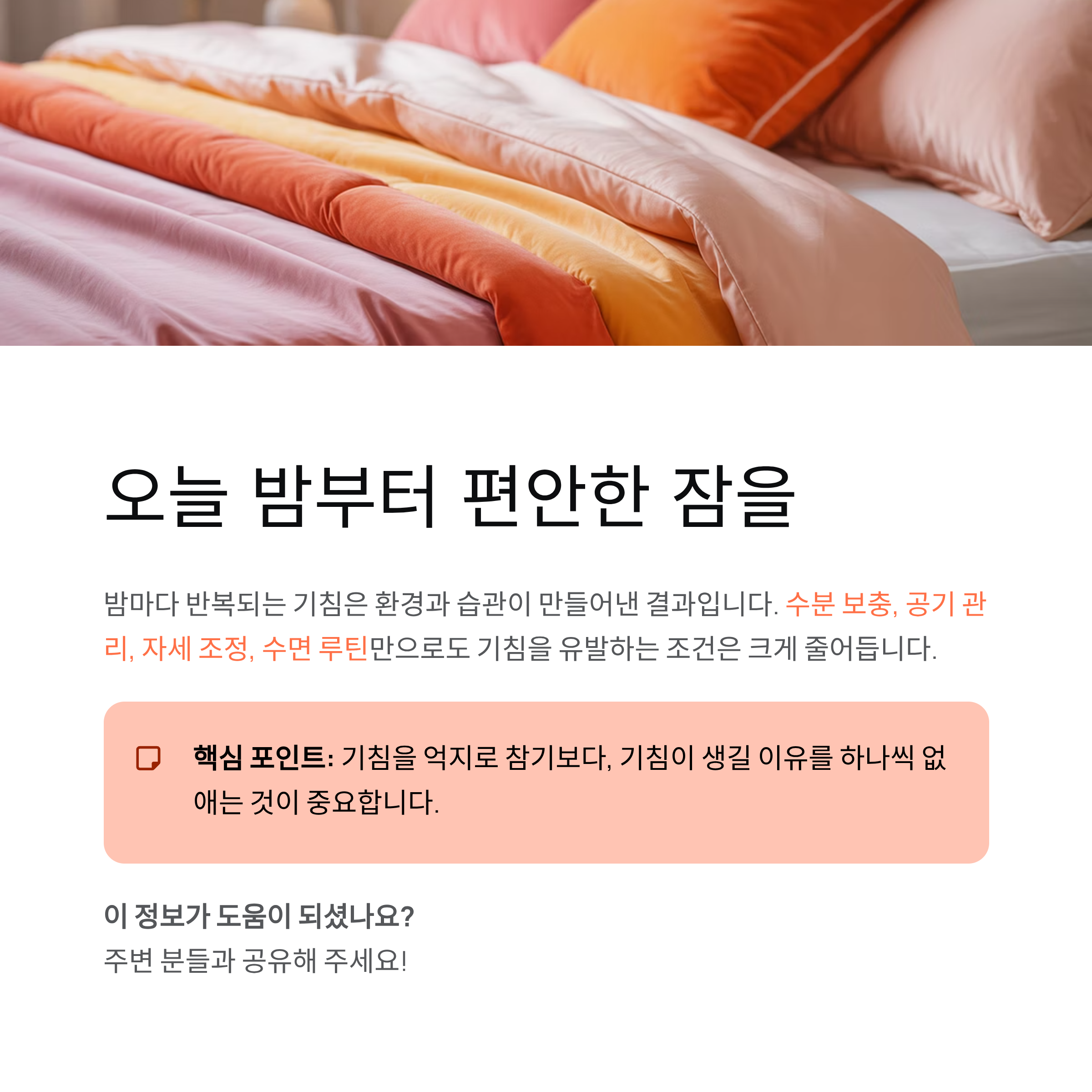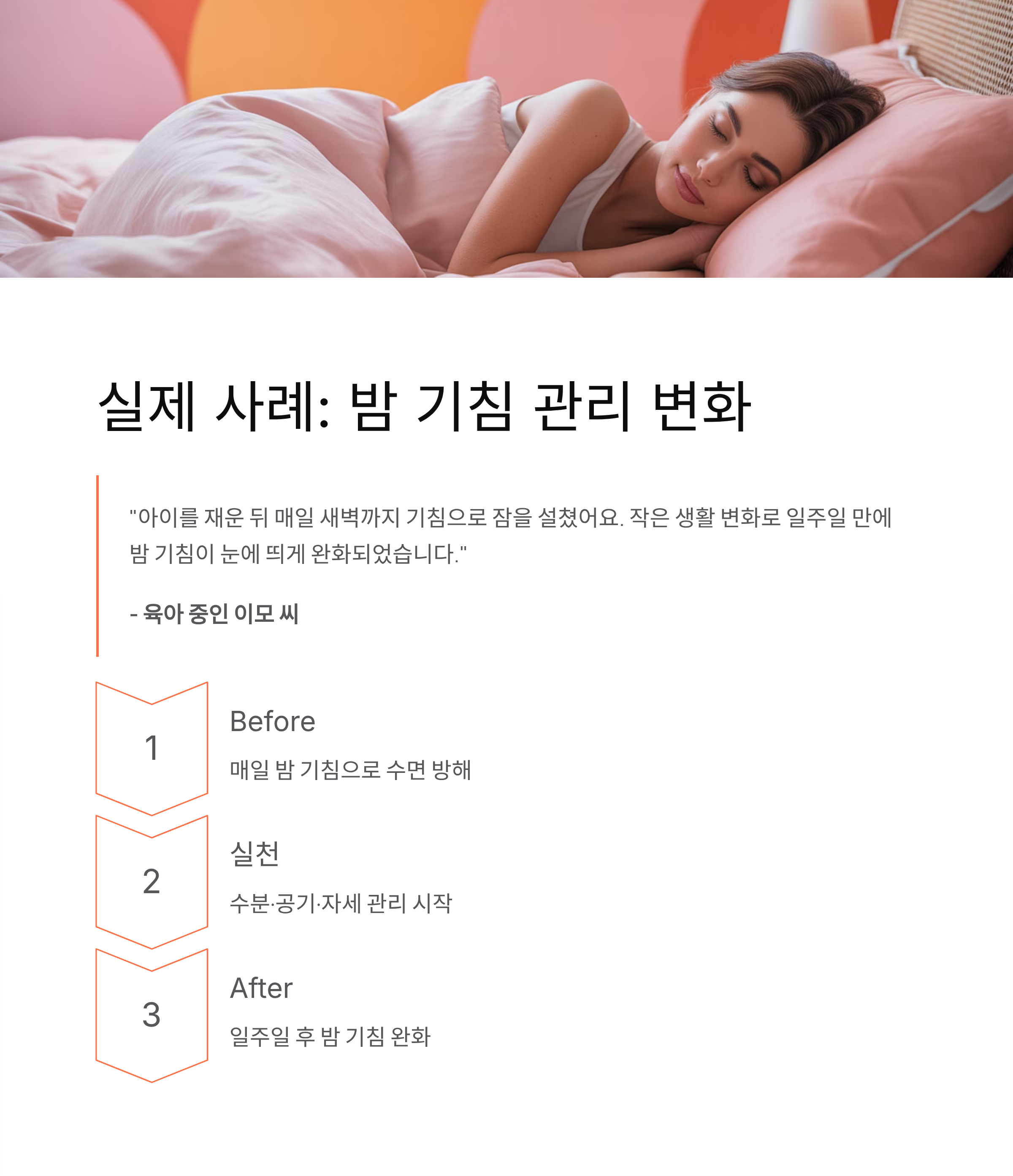 육아 중인 이모 씨는 아이를 재운 뒤 잠자리에 들면 기침이 심해져 매일 새벽까지 잠을 설쳤습니다. 낮에는 괜찮았기에 대수롭지 않게 넘겼지만, 피로가 누적되면서 관리의 필요성을 느꼈습니다. 이후 잠들기 전 물을 조금씩 마시고, 실내 공기를 관리하며, 상체를 살짝 세운 자세로 잠들기 시작했습니다. 며칠 후 밤중에 깨는 횟수가 줄었고, 일주일 정도 지나자 밤 기침이 눈에 띄게 완화되었습니다. 작은 생활 변화가 수면과 기침 모두에 긍정적인 영향을 준 사례입니다.