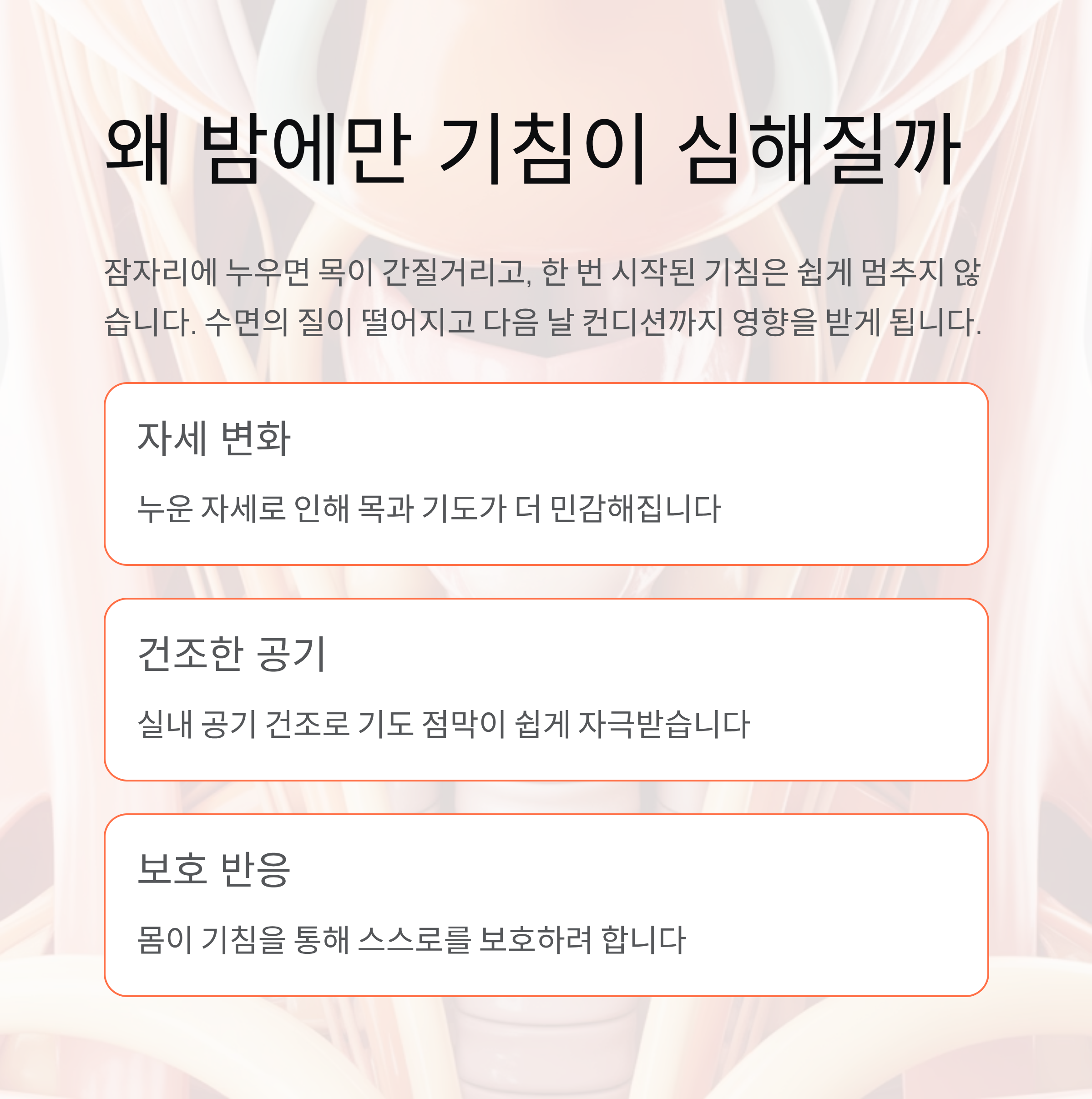 왜 낮보다 밤에 기침이 심해지나요. 자세 변화와 공기 건조, 피로 누적이 함께 작용하기 때문입니다.