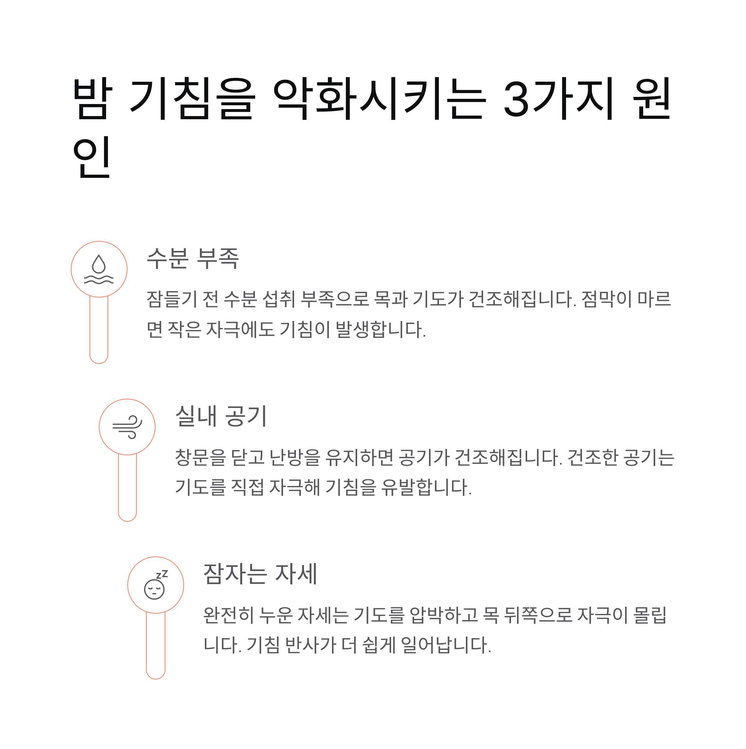 밤 기침의 핵심 원인은 자세와 환경 변화입니다. 낮에는 앉거나 서 있는 시간이 많아 기도가 비교적 편안하지만, 밤에는 누운 자세로 인해 목과 기도가 더 민감해집니다. 여기에 실내 공기의 건조함까지 더해지면 기도 점막은 쉽게 자극을 받습니다. 이 자극이 반복되면 몸은 기침을 통해 스스로를 보호하려고 하고, 그 결과 밤마다 기침이 심해지는 흐름이 만들어집니다.