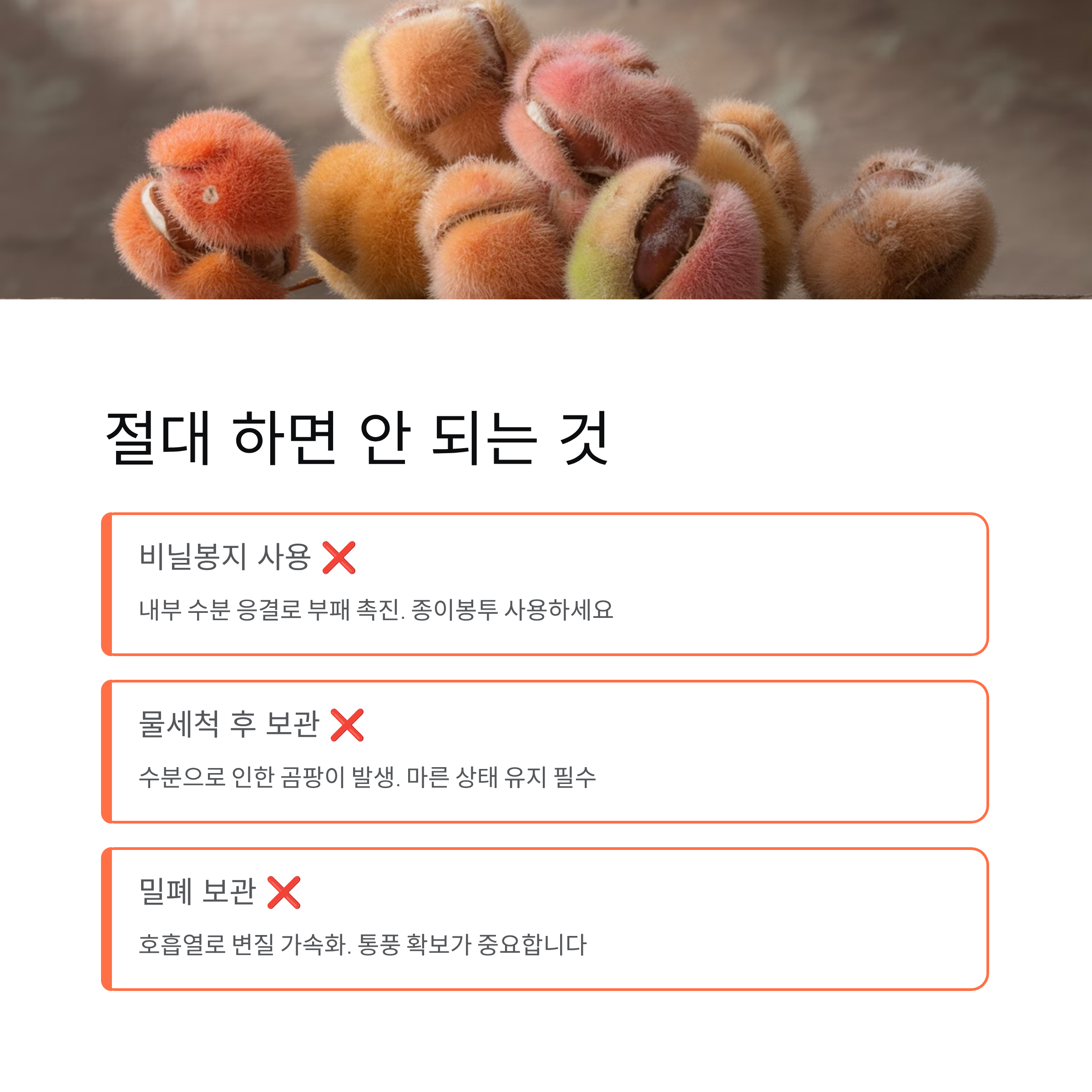 또한 밤은 수확 후에도 호흡을 계속하기 때문에, 통풍이 되지 않는 곳에 두면 내부 열이 쌓이며 금세 부패합니다.
