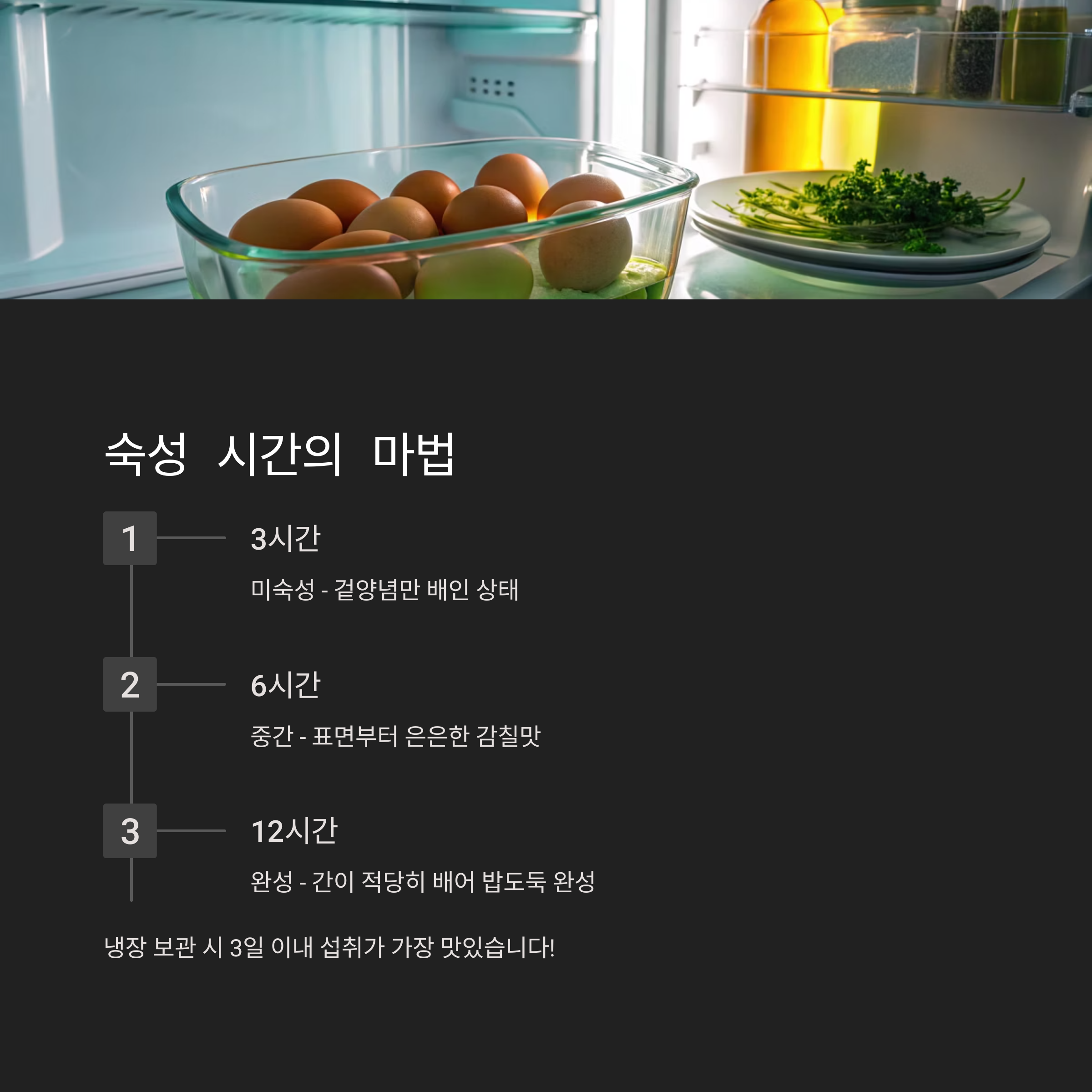 냉장고에서 최소 6시간~12시간 이상 숙성시키고, 3일 이내 섭취하는 것이 가장 좋습니다.
