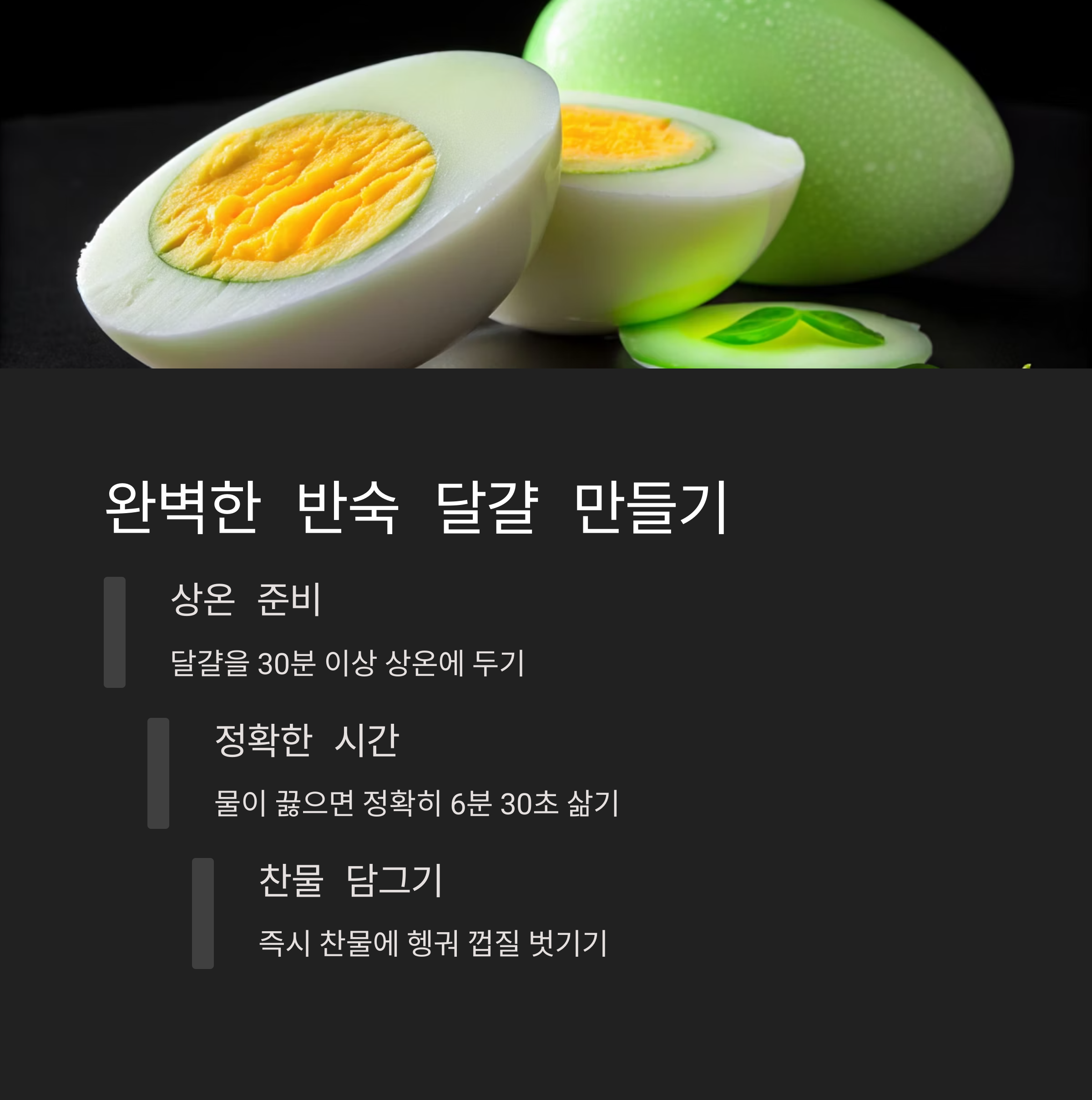 달걀은 상온에 30분 이상 두었다가 사용하며, 물이 끓기 시작하면 6분 30초를 정확히 맞춰 삶습니다.