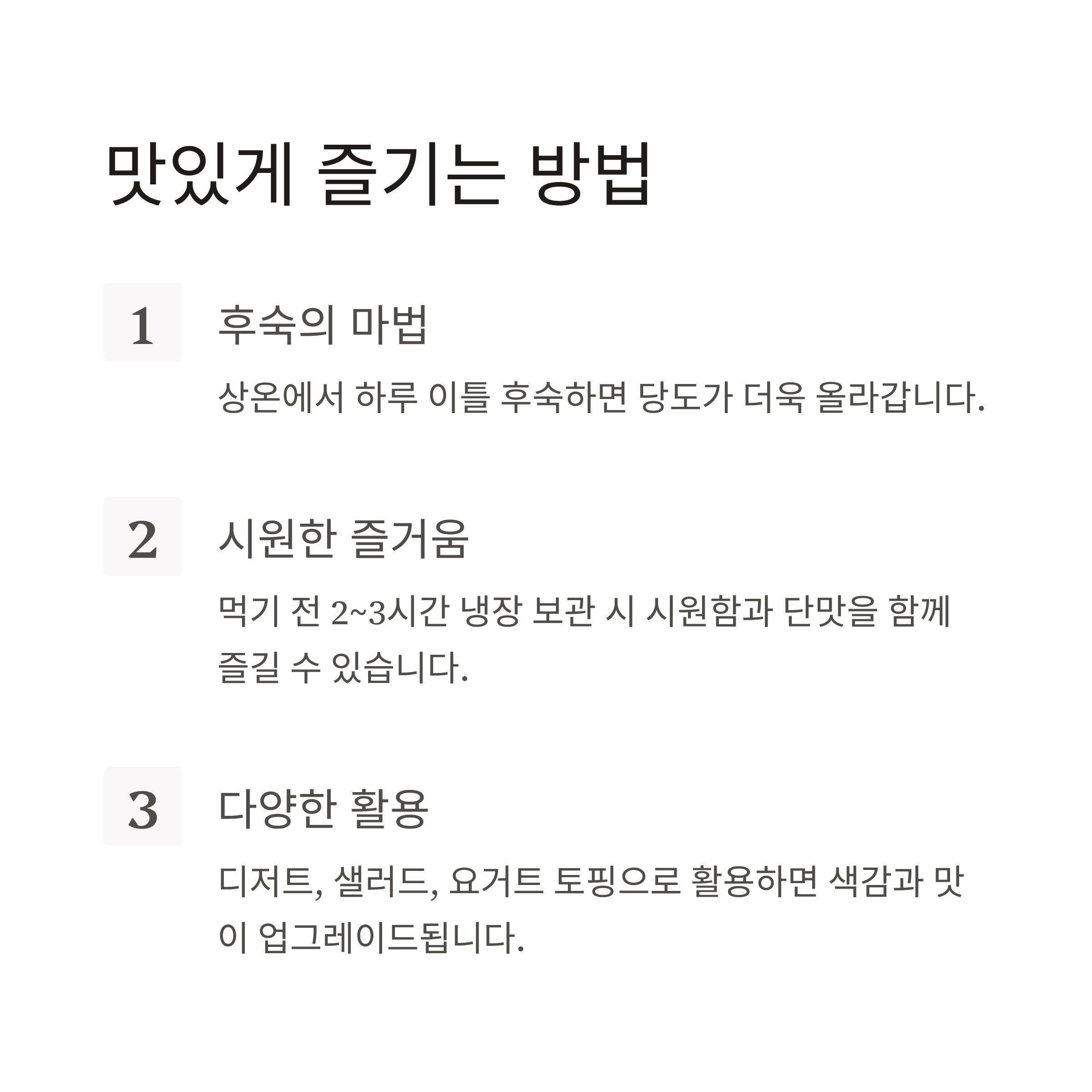 - 먹기 전 2~3시간 냉장 보관 시 시원함과 단맛을 함께 즐길 수 있습니다.