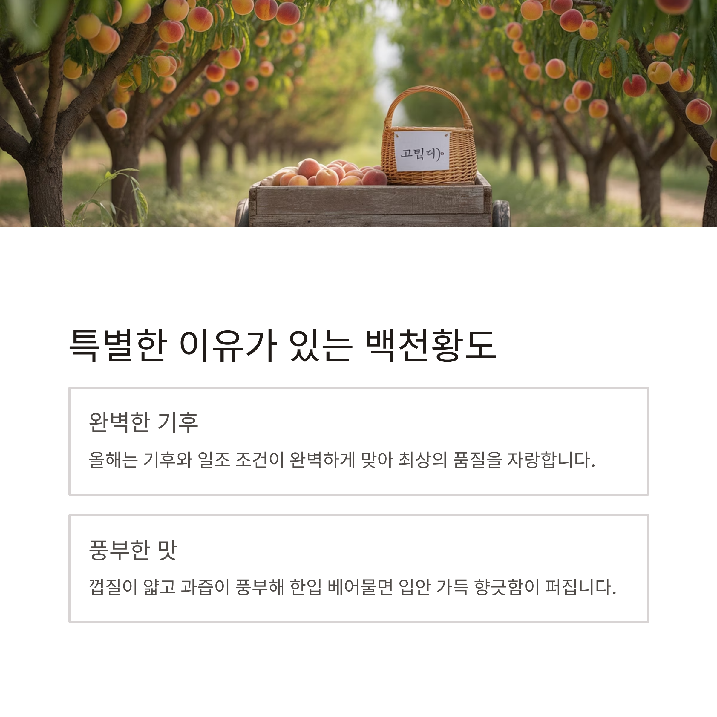 특히 올해 백천황도는 기후와 일조 조건이 완벽하게 맞아 평년보다 당도가 높고 향이 진한 최상의 품질을 자랑합니다.