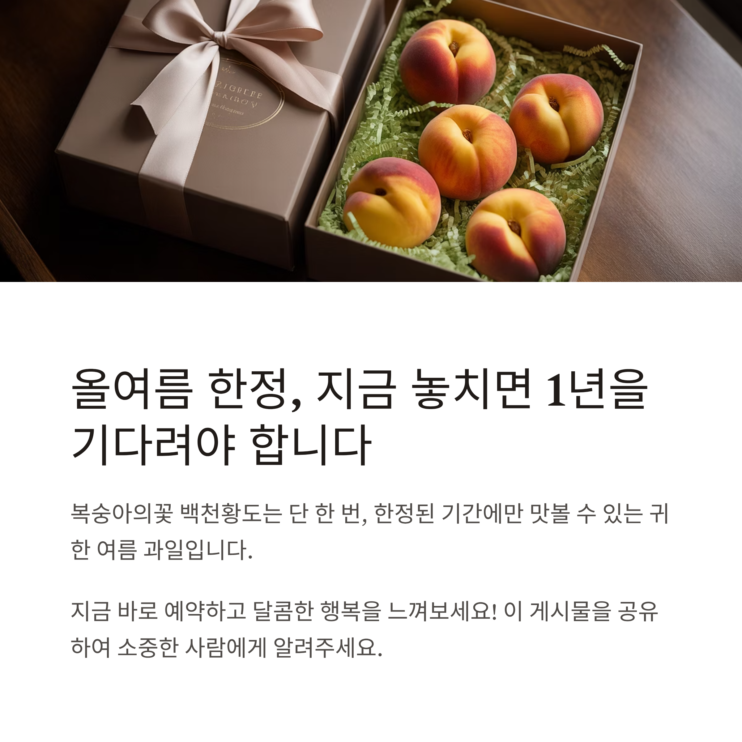 올여름, 복숭아의꽃이 자신 있게 선보이는 프리미엄 백천황도 예약 판매가 시작되었습니다.