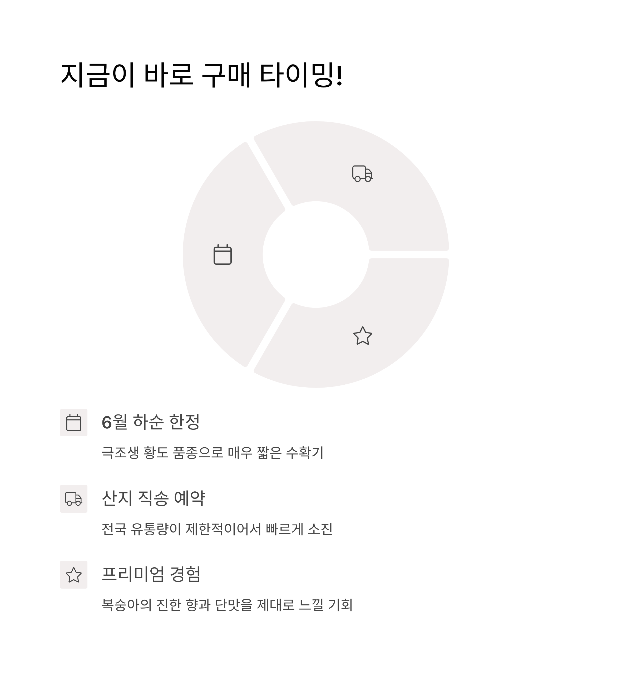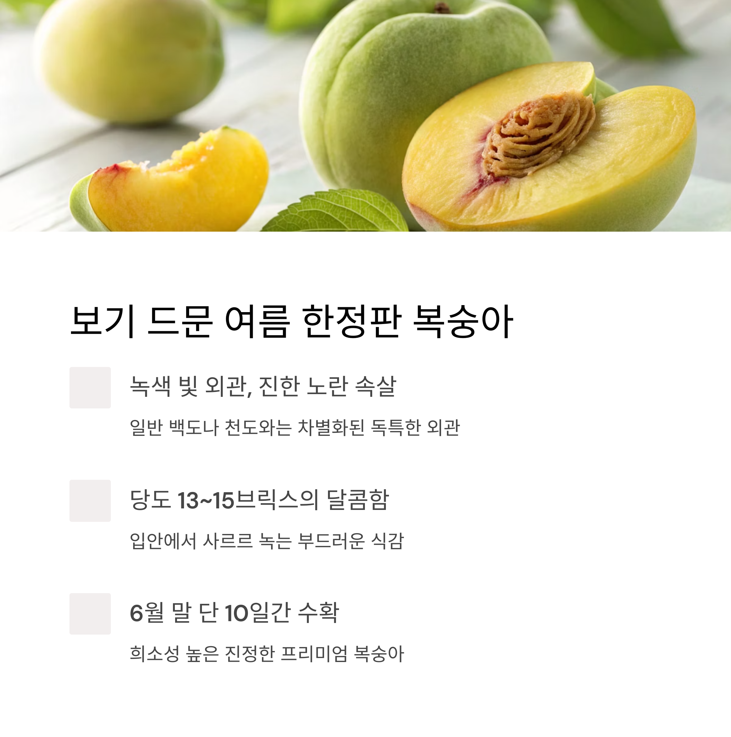 당도, 향, 식감 모두에서 프리미엄 복숭아의 진가를 보여주는 과일입니다.