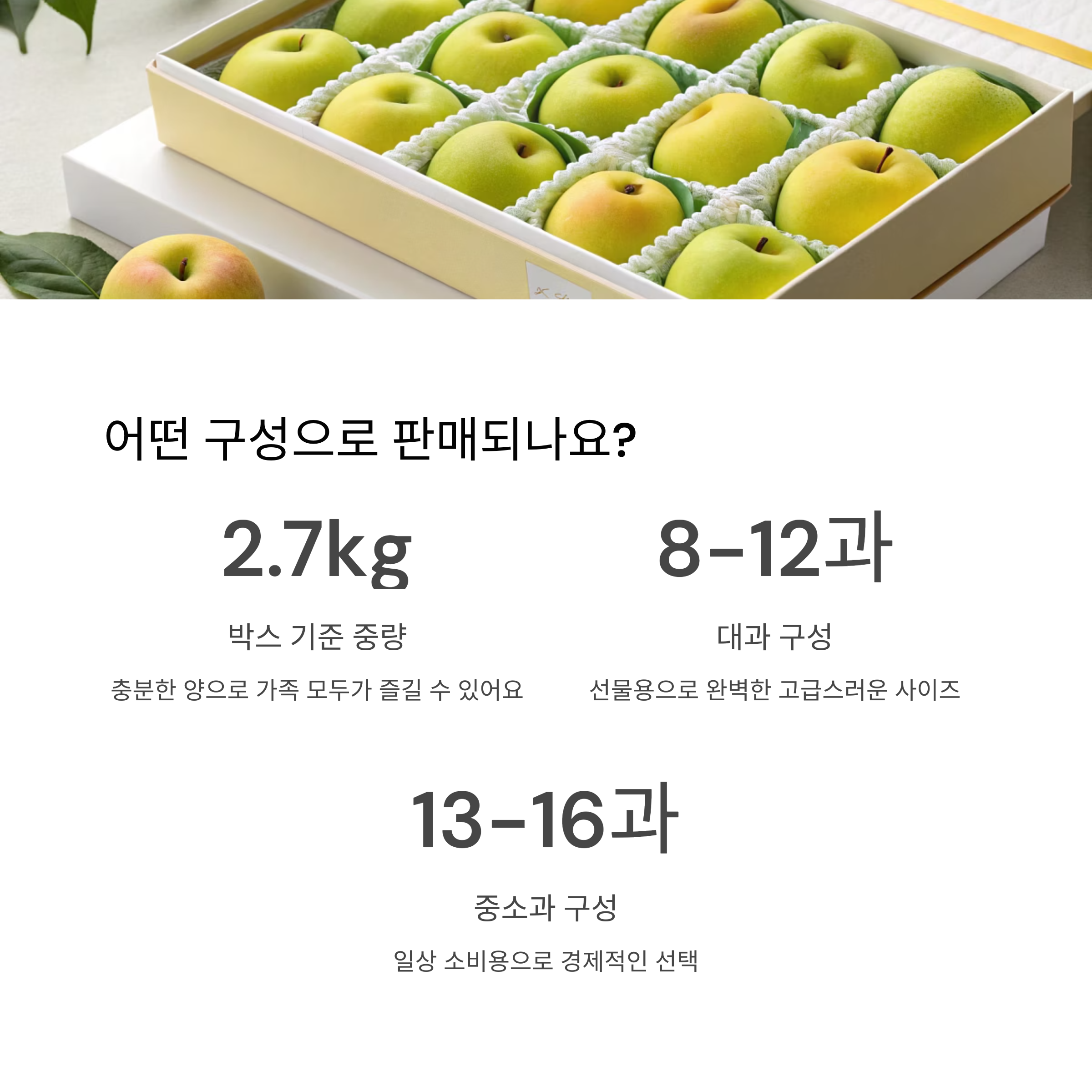선물용으로는 대과형, 일상 소비용으로는 중소과형을 추천합니다.