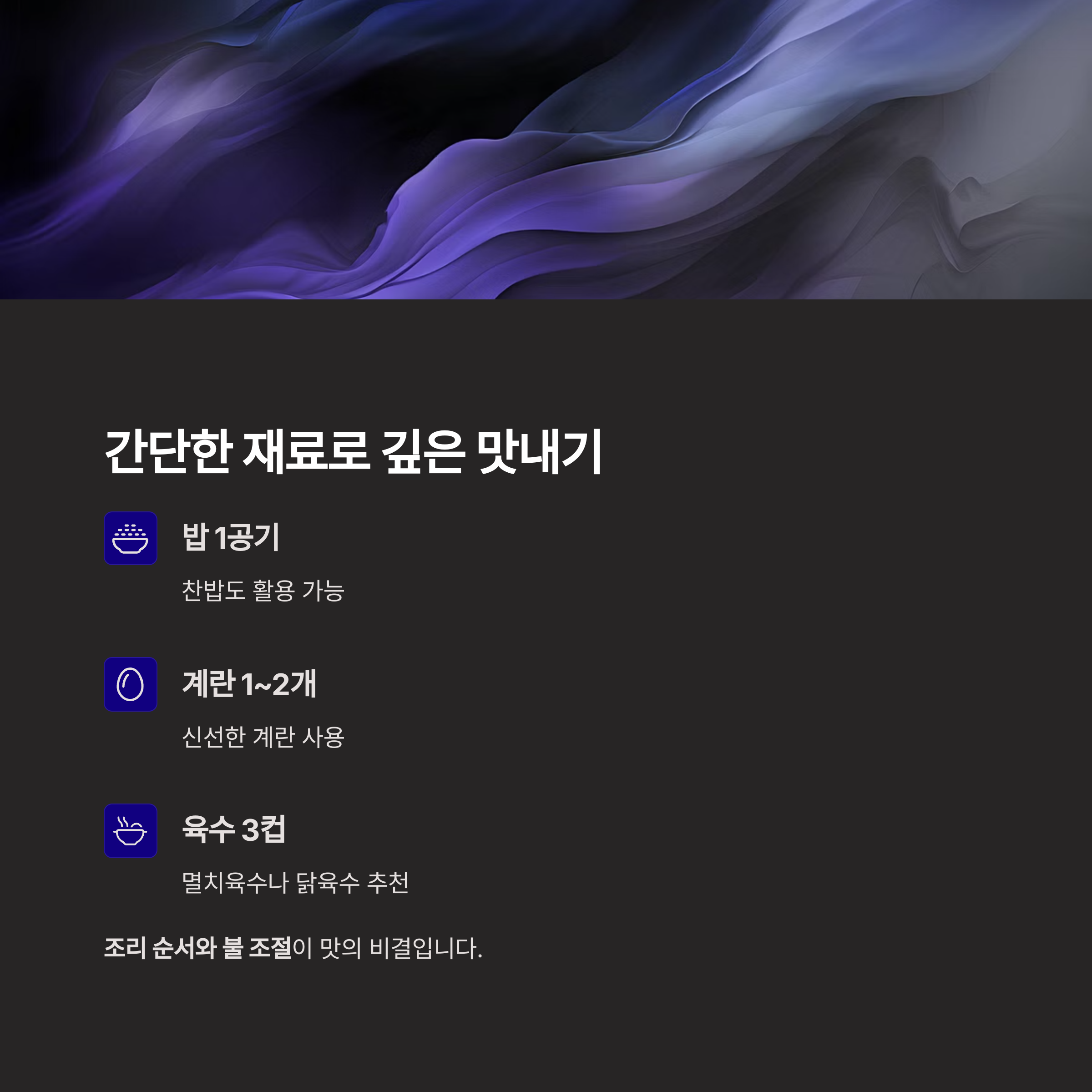 쌀 대신 밥으로, 물 대신 육수로, 계란의 고소함을 더해 영양까지 잡을 수 있는 계란죽 레시피를 소개합니다.