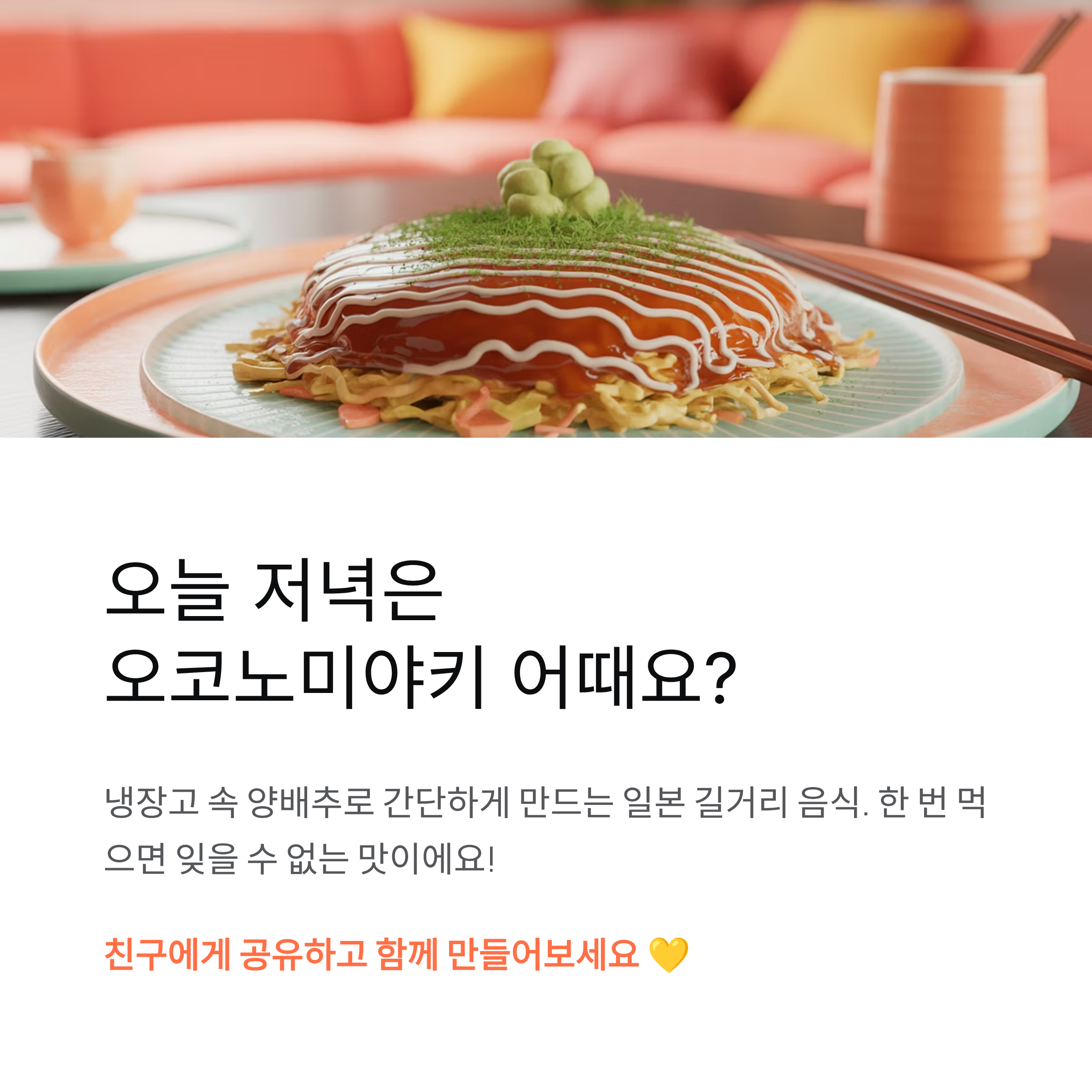 오늘 저녁은 양배추 오코노미야키로 따뜻한 시간을 만들어보세요.