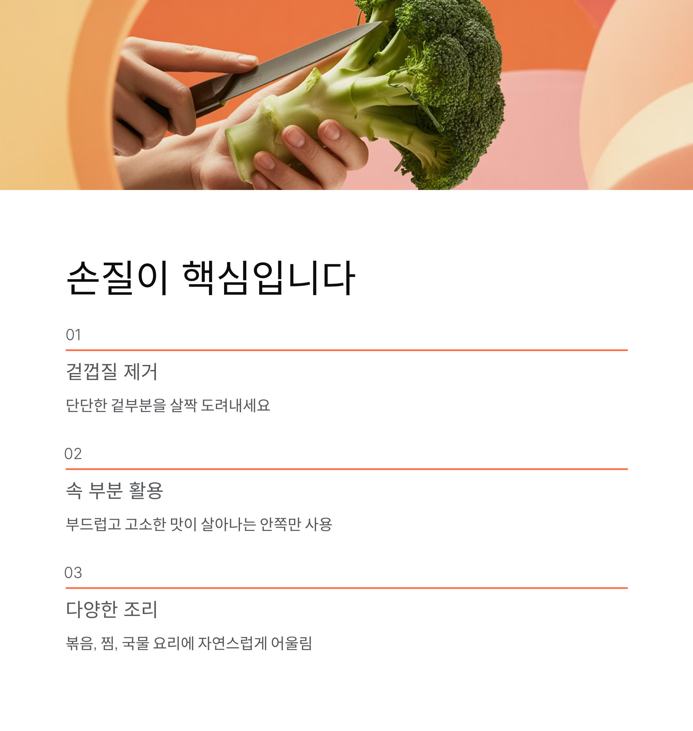 줄기는 꽃송이보다 식감이 단단하고 묵직한 느낌이 있지만 조리하면 은근한 단맛이 살아납니다. 버리기 아까운 부분이 아니라 오히려 활용도 높은 재료라서 다양한 방식으로 조리가 가능합니다. 특히 단면이 깔끔하게 유지돼 썰어 두면 요리에 활용하기가 훨씬 편합니다.
