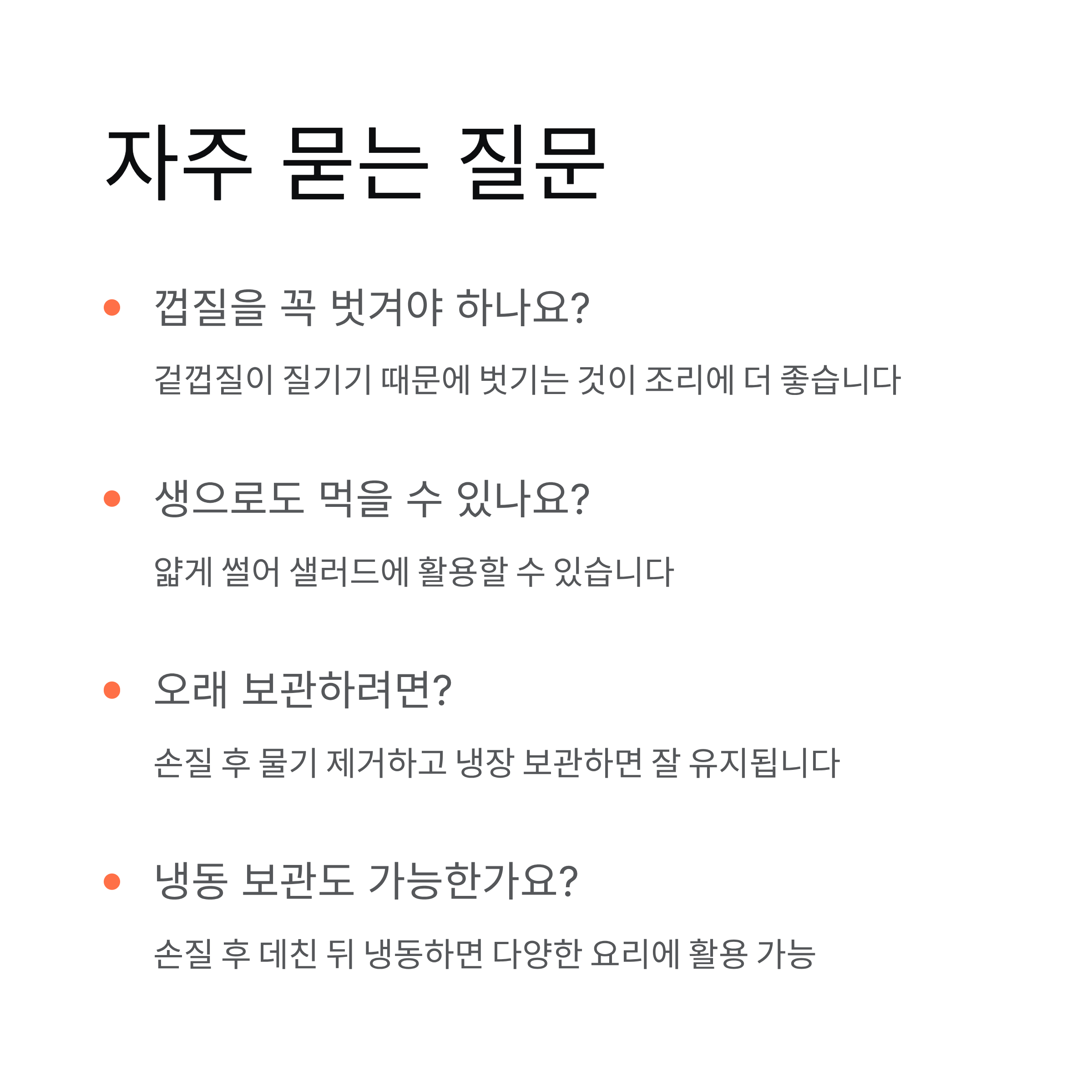 A 겉껍질이 질기기 때문에 벗기는 것이 조리에 더 좋습니다.