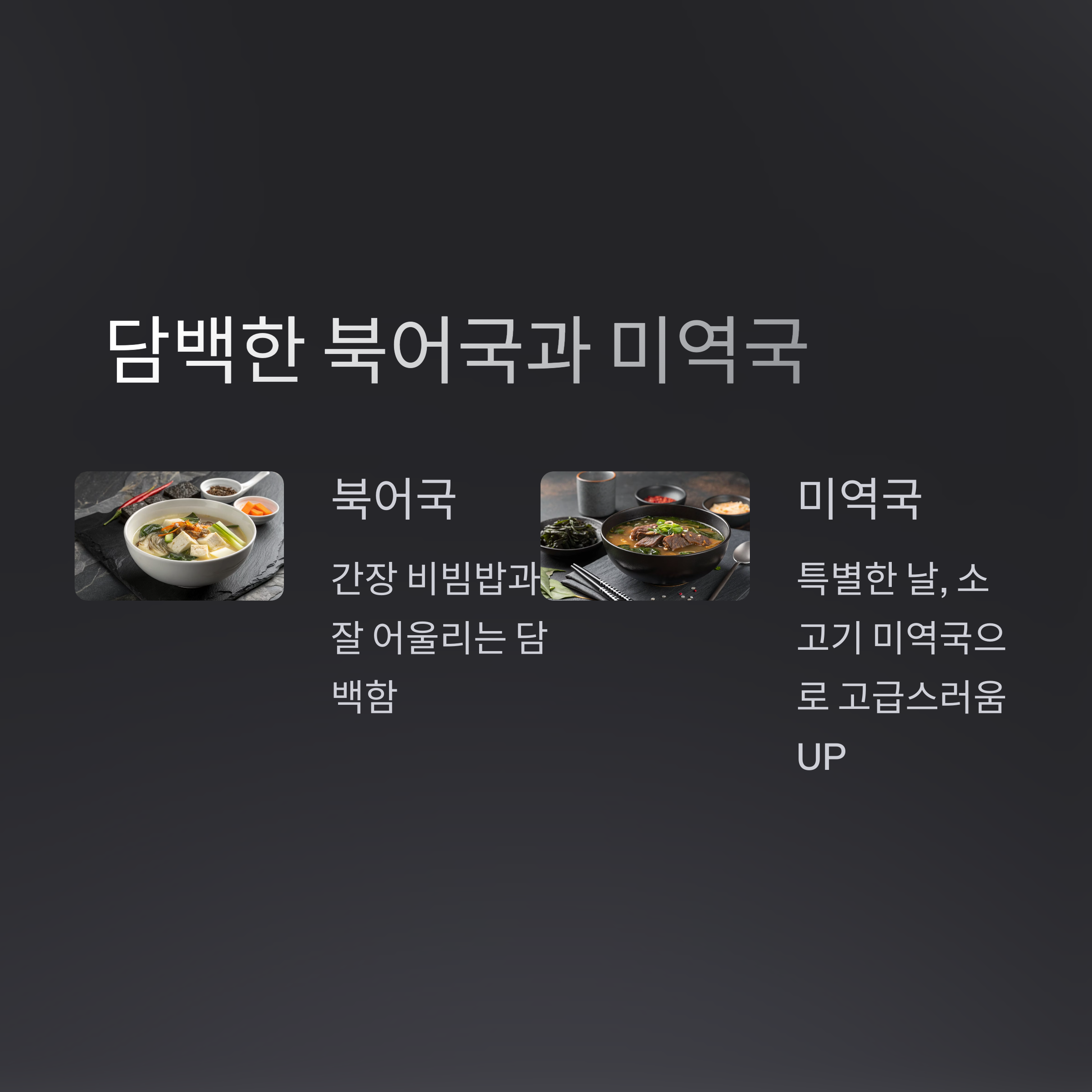 북어국은 간장 또는 간이 약한 비빔밥과 잘 어울립니다.