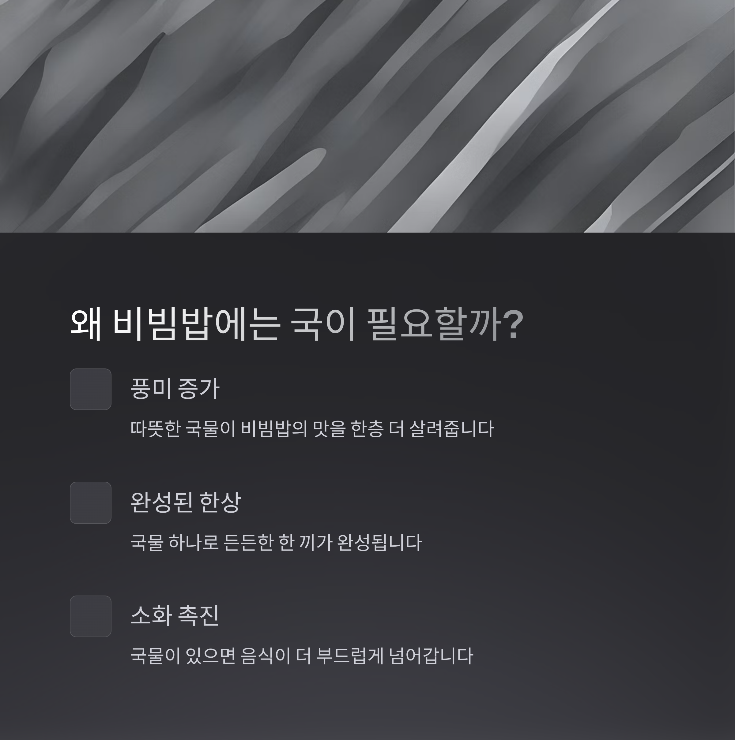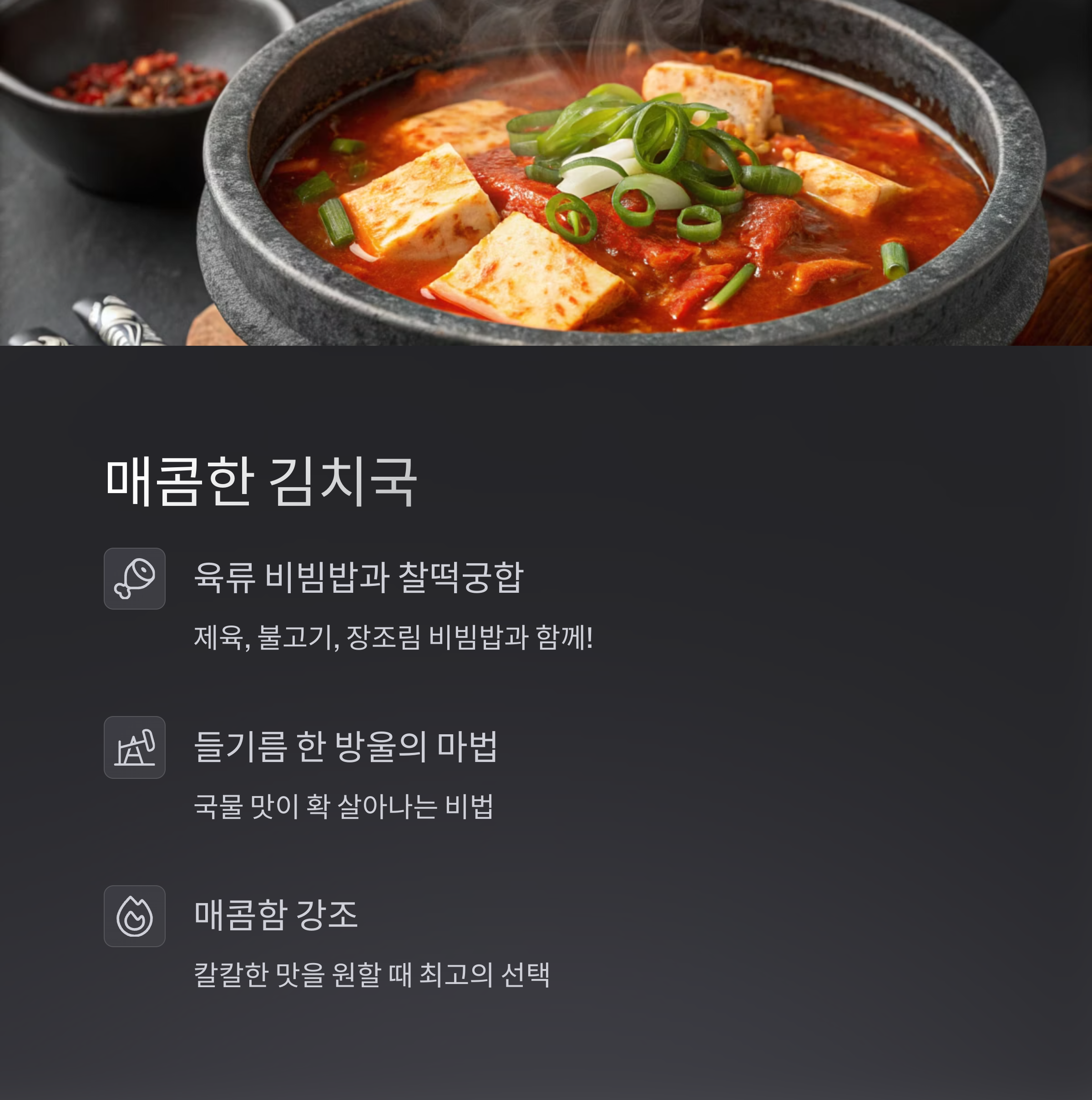김치국은 제육볶음, 불고기, 장조림 등의 육류 비빔밥과 찰떡입니다.