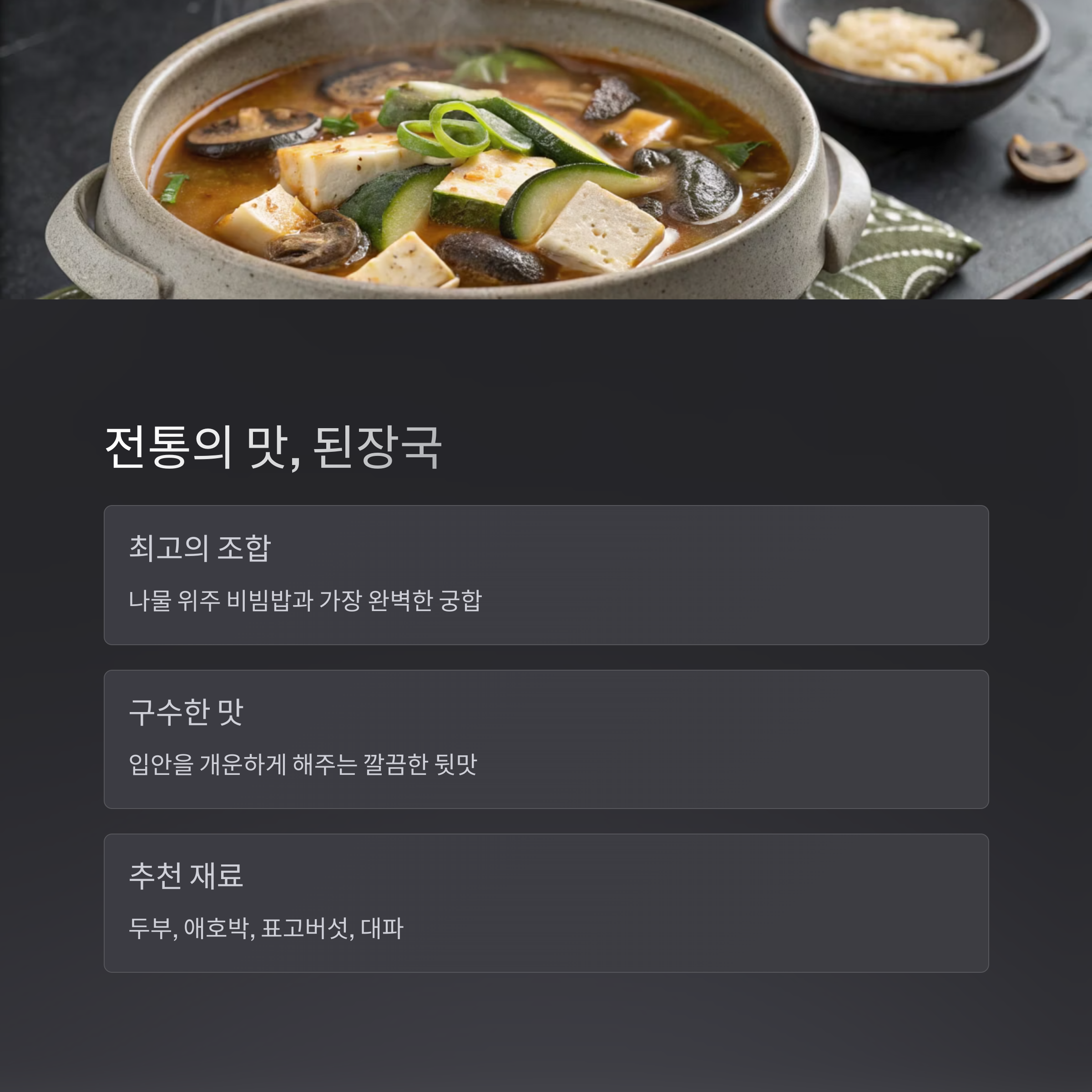 따뜻하고 개운한 국물 하나만 곁들여도 풍미가 완전히 달라집니다.
