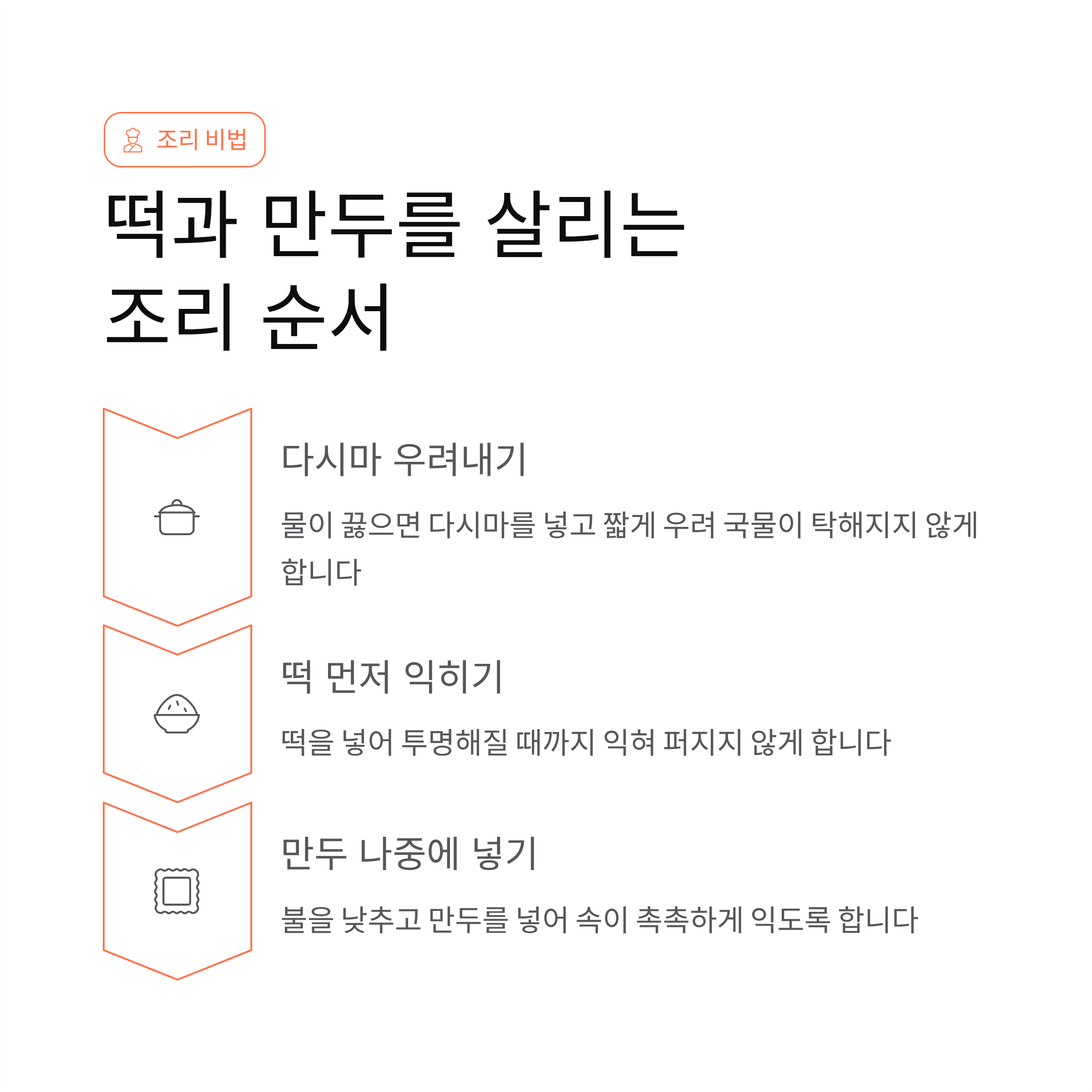 사골을 쓰지 않는 떡만두국에서는 조리 순서가 더욱 중요해집니다. 국물 맛이 가벼운 대신 재료의 식감이 그대로 드러나기 때문입니다. 먼저 떡을 넣어 투명해질 때까지 익힌 뒤 불을 낮추고 만두를 넣는 것이 핵심입니다. 이 순서를 지키면 떡은 퍼지지 않고, 만두 속은 촉촉함을 유지합니다.