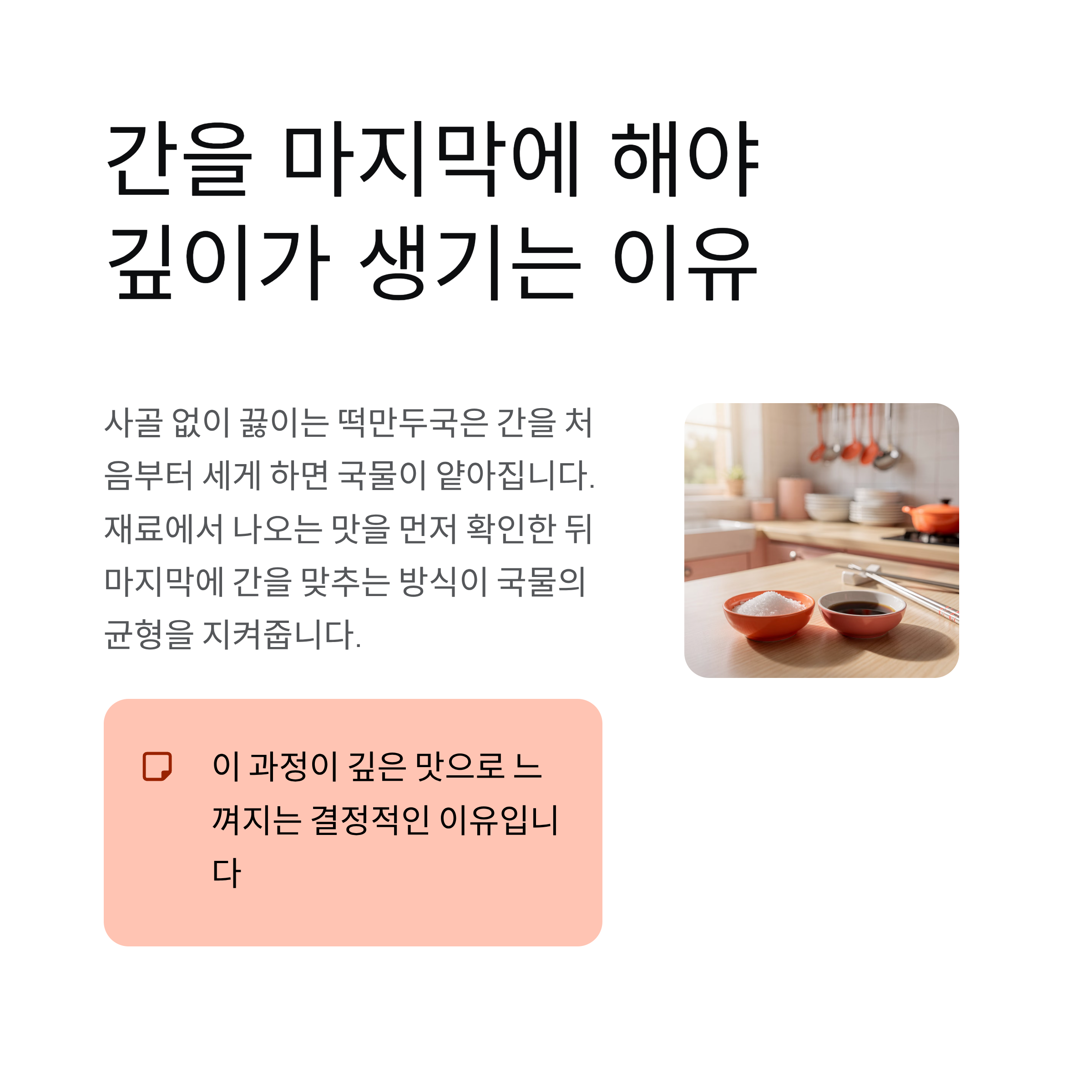 사골 국물은 이미 맛의 중심이 잡혀 있어 간을 먼저 해도 큰 문제가 생기지 않습니다. 하지만 사골 없이 끓이는 떡만두국은 간을 처음부터 세게 하면 국물이 얕아집니다. 재료에서 나오는 맛을 먼저 확인한 뒤 마지막에 간을 맞추는 방식이 국물의 균형을 지켜줍니다. 이 과정이 깊은 맛으로 느껴지는 결정적인 이유입니다.