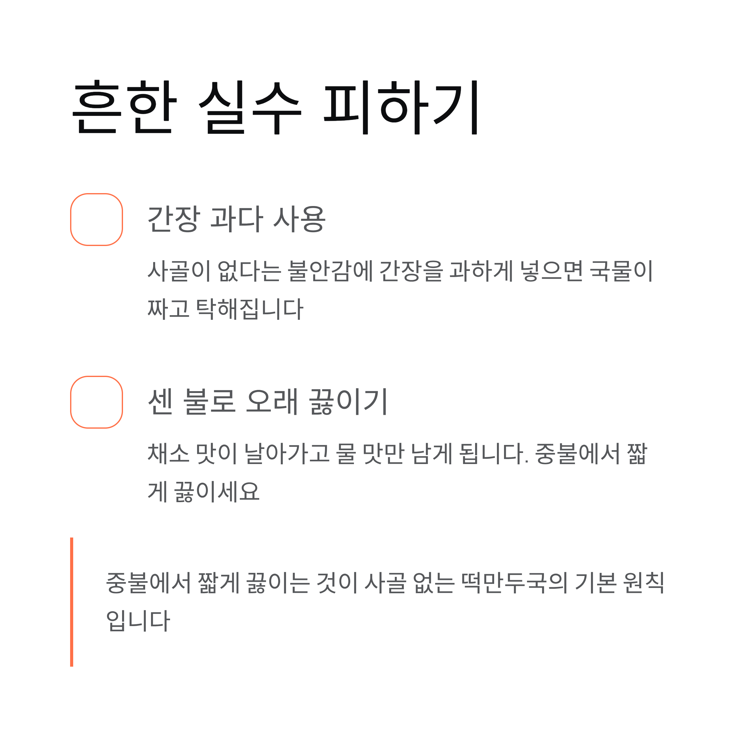 사골이 없다는 불안감 때문에 간장을 과하게 넣는 경우가 많습니다. 이 경우 국물이 짜고 탁해지며 깊이가 아닌 자극만 남습니다. 또 센 불로 오래 끓이면 채소 맛이 날아가고 물 맛만 남게 됩니다. 중불에서 짧게 끓이는 것이 사골 없는 떡만두국의 기본 원칙입니다.