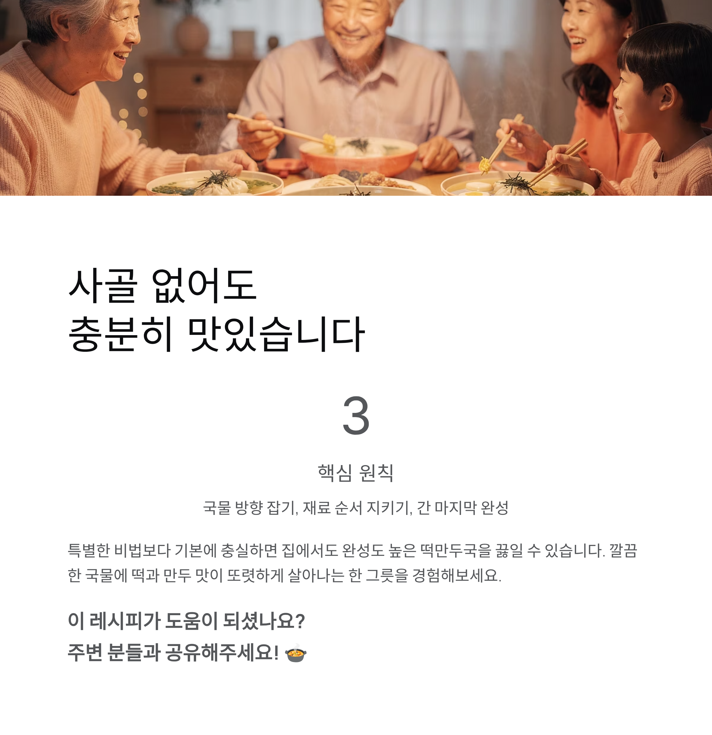 사골 안 써도 깊은 맛을 내는 떡만두국은 특별한 비법보다 기본에 있습니다. 국물의 방향을 잡고, 재료 순서를 지키며, 간을 마지막에 완성하는 것. 이 세 가지 흐름만 지켜도 집에서 끓이는 떡만두국은 충분히 완성도 높은 한 그릇이 됩니다. 다음에는 사골 없이도 자신 있게 끓여보셔도 좋겠습니다.