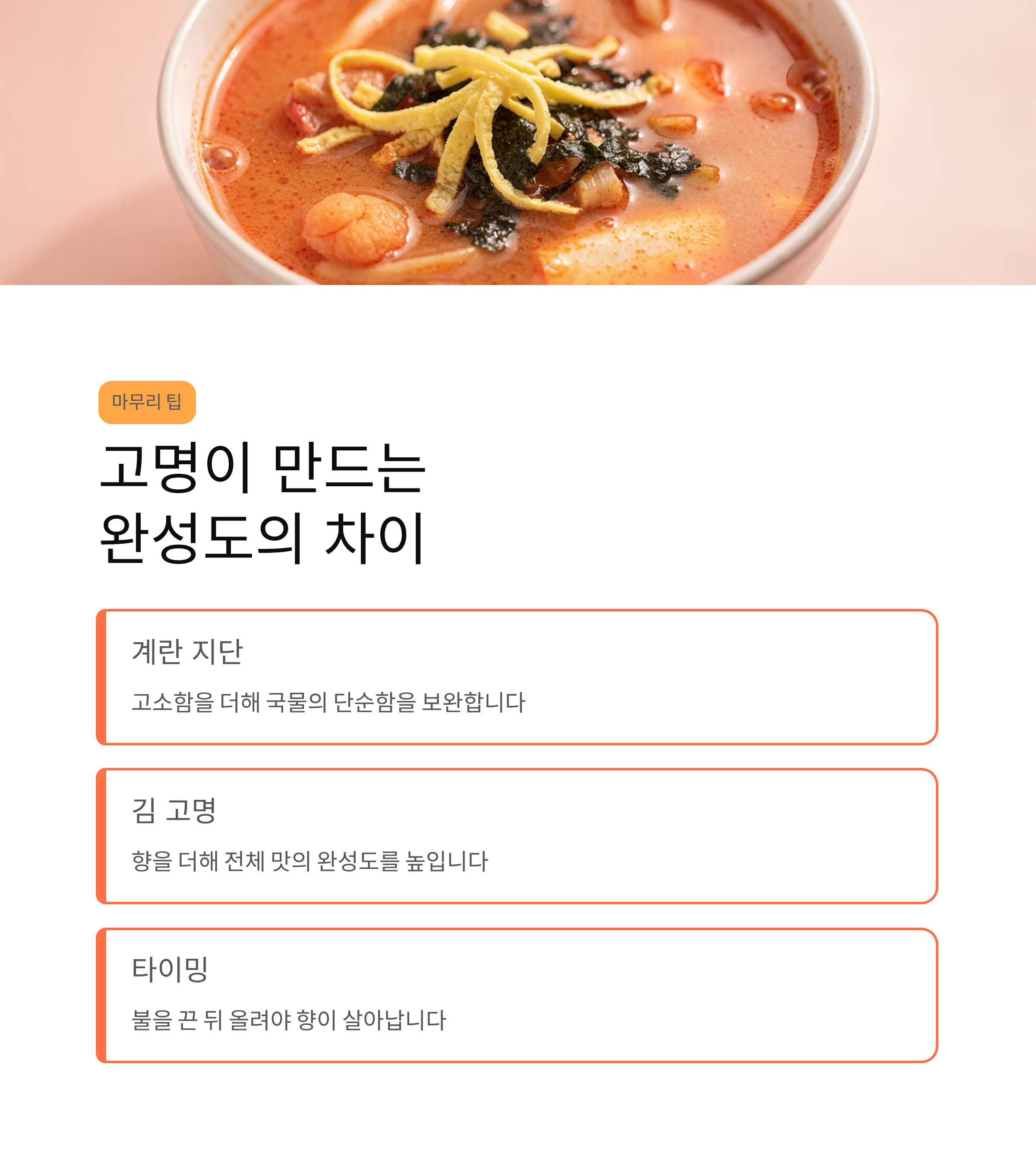 사골을 쓰지 않을수록 고명의 역할은 더 중요해집니다. 계란 지단과 김 고명은 고소함과 향을 더해 국물의 단순함을 보완합니다. 고명은 불을 끈 뒤 올리는 것이 좋습니다. 열에 오래 노출되면 향이 사라지기 때문에 마지막 단계에서 더해야 전체 맛의 완성도가 올라갑니다.