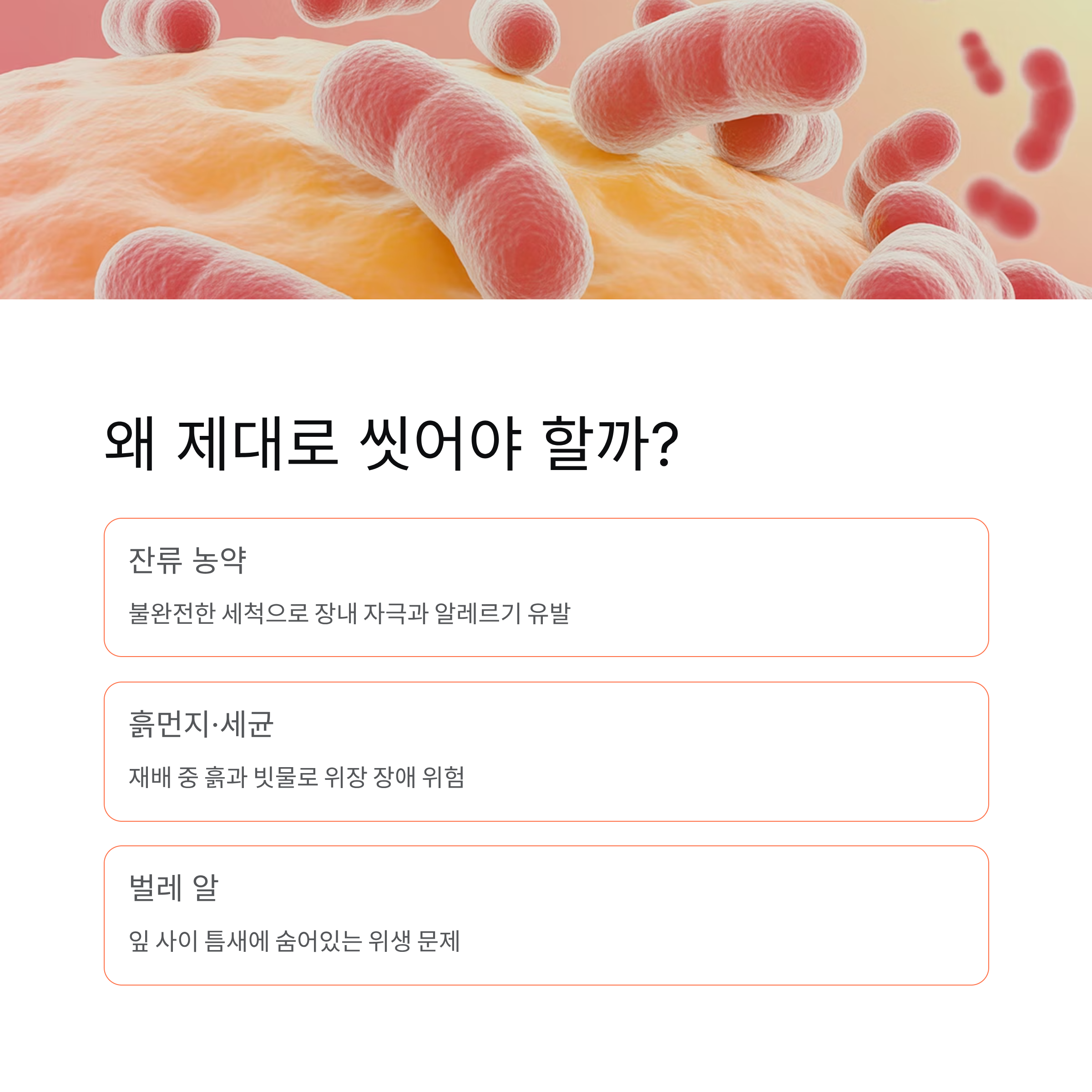 상추는 재배 과정에서 흙먼지, 농약 잔류물, 미세한 벌레 알 등이 붙을 수 있습니다.