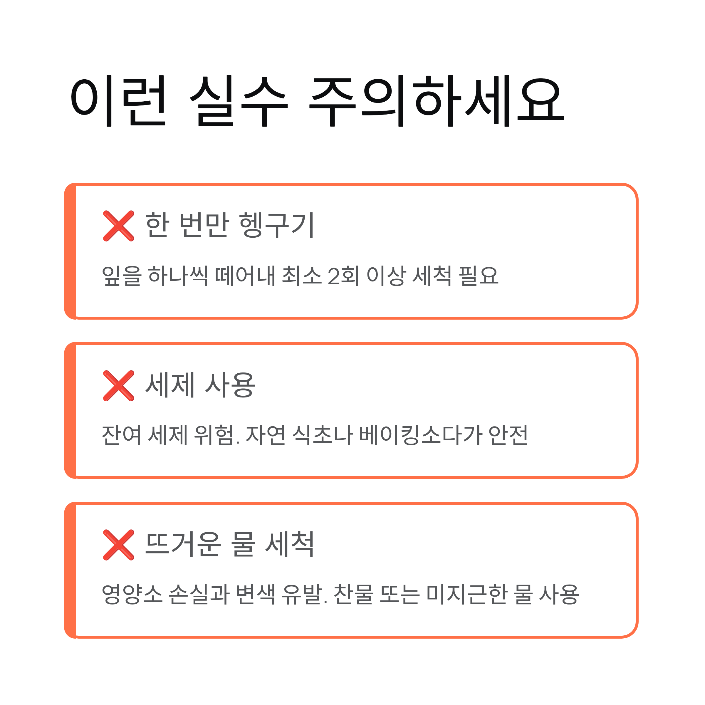 최소 2회 이상, 잎을 하나씩 떼어내 세척해야 합니다. - 세제 사용