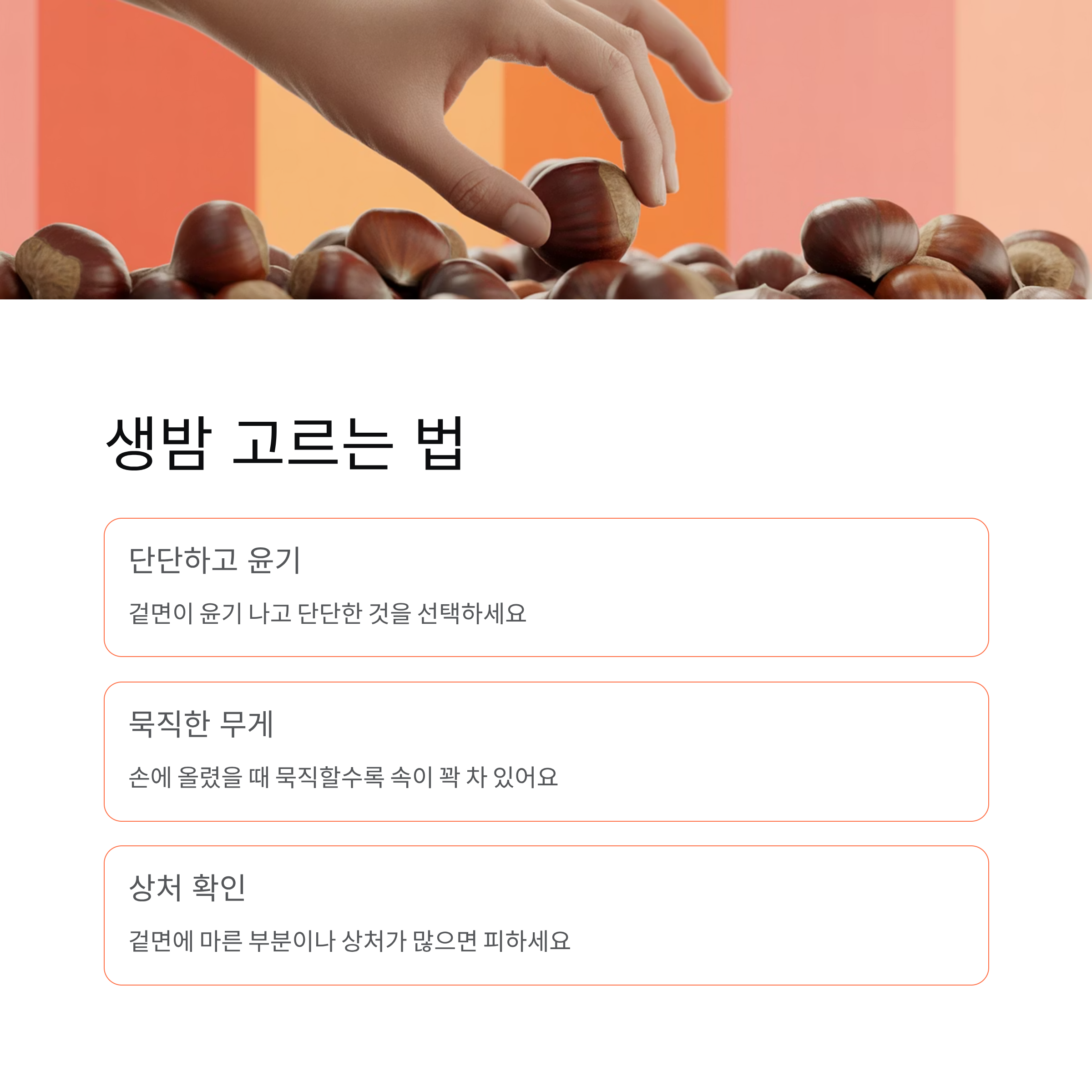 생밤을 고를 때는 단단하고 윤기가 나는지 먼저 확인하면 좋아요. 손에 올렸을 때 묵직할수록 속이 꽉 차 있는 경우가 많고, 겉면에 지나치게 마른 부분이나 상처가 많다면 오래된 밤일 가능성이 있어 피하는 게 좋아요. 기본적인 특징만 잘 알고 있어도 선택에서부터 만족도가 확 달라져요.