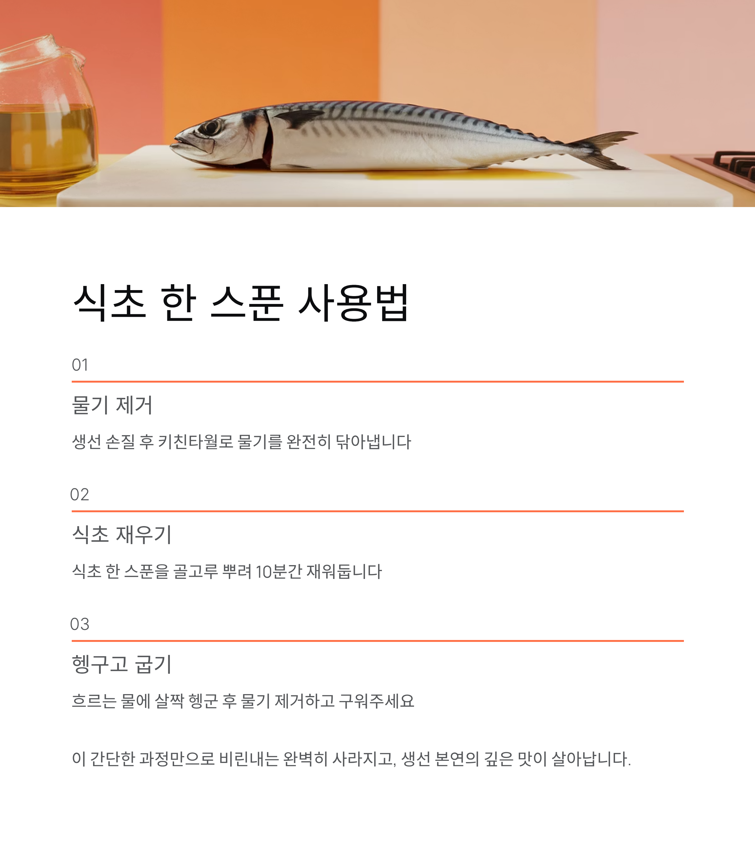 식초는 냄새뿐 아니라 잡내를 없애고, 생선 특유의 깊은 맛을 살려줍니다.