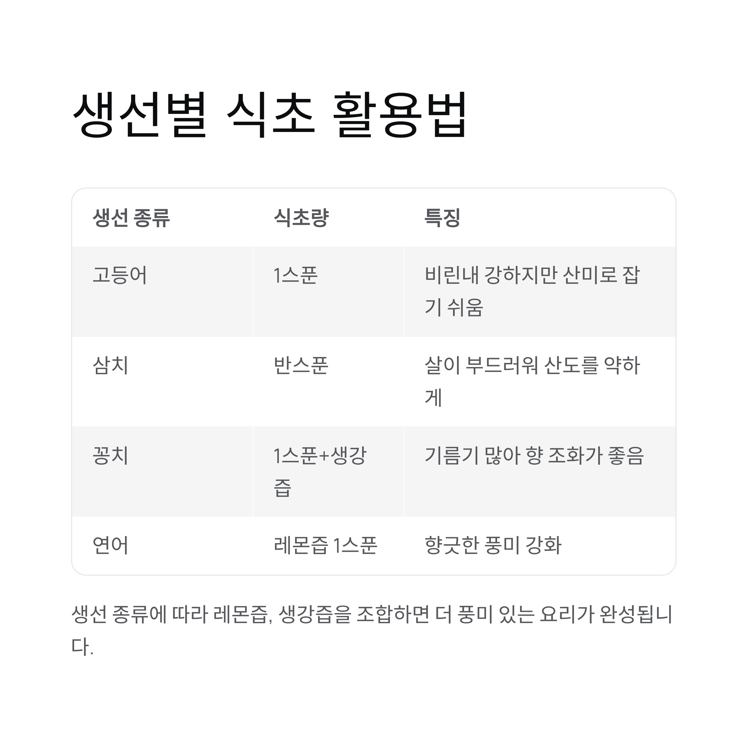 | 고등어 | 1스푼 | 비린내 강하지만 산미로 잡기 쉬움 |