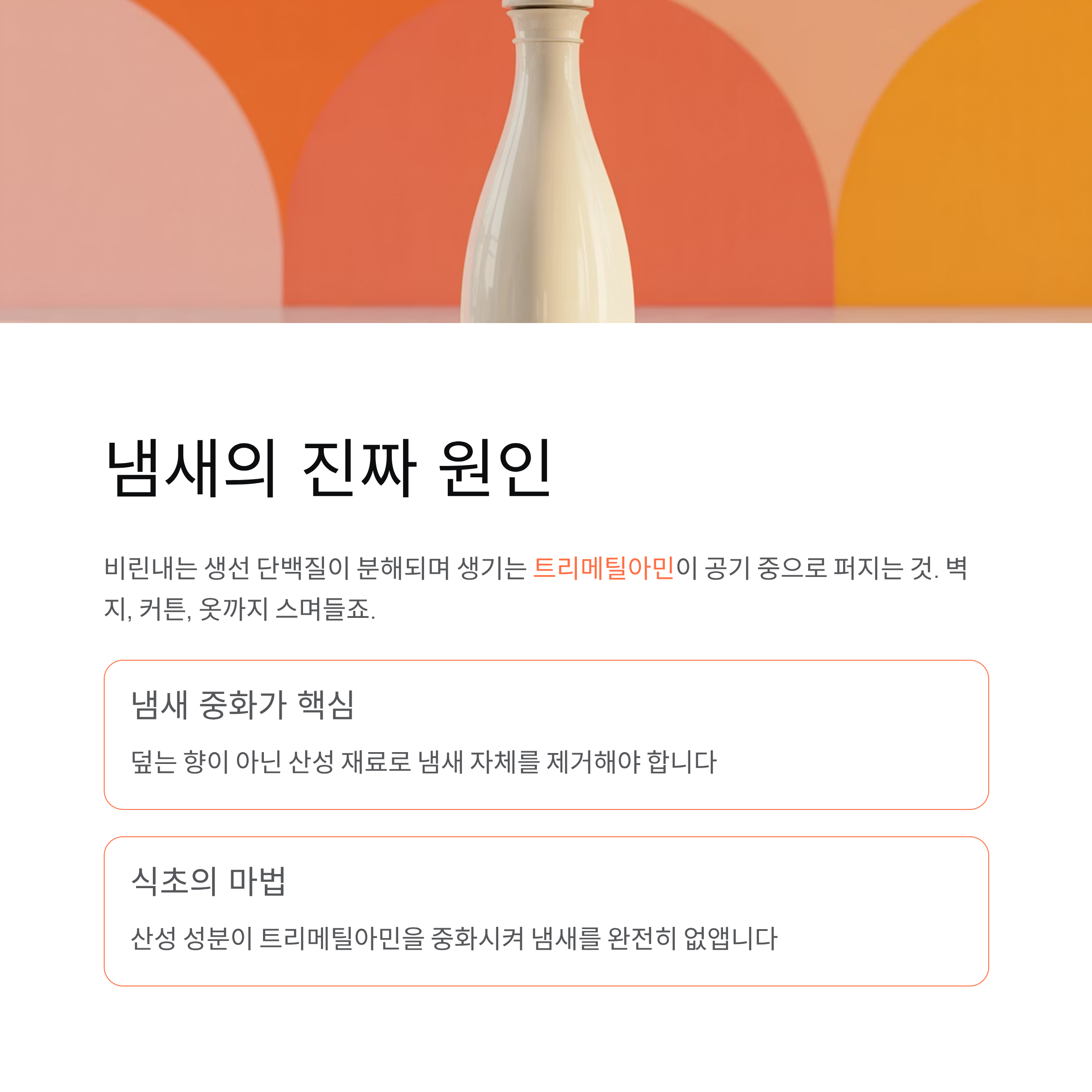 ‘덮는 향’이 아니라 ‘냄새를 중화시키는 산성 재료’가 필요합니다.