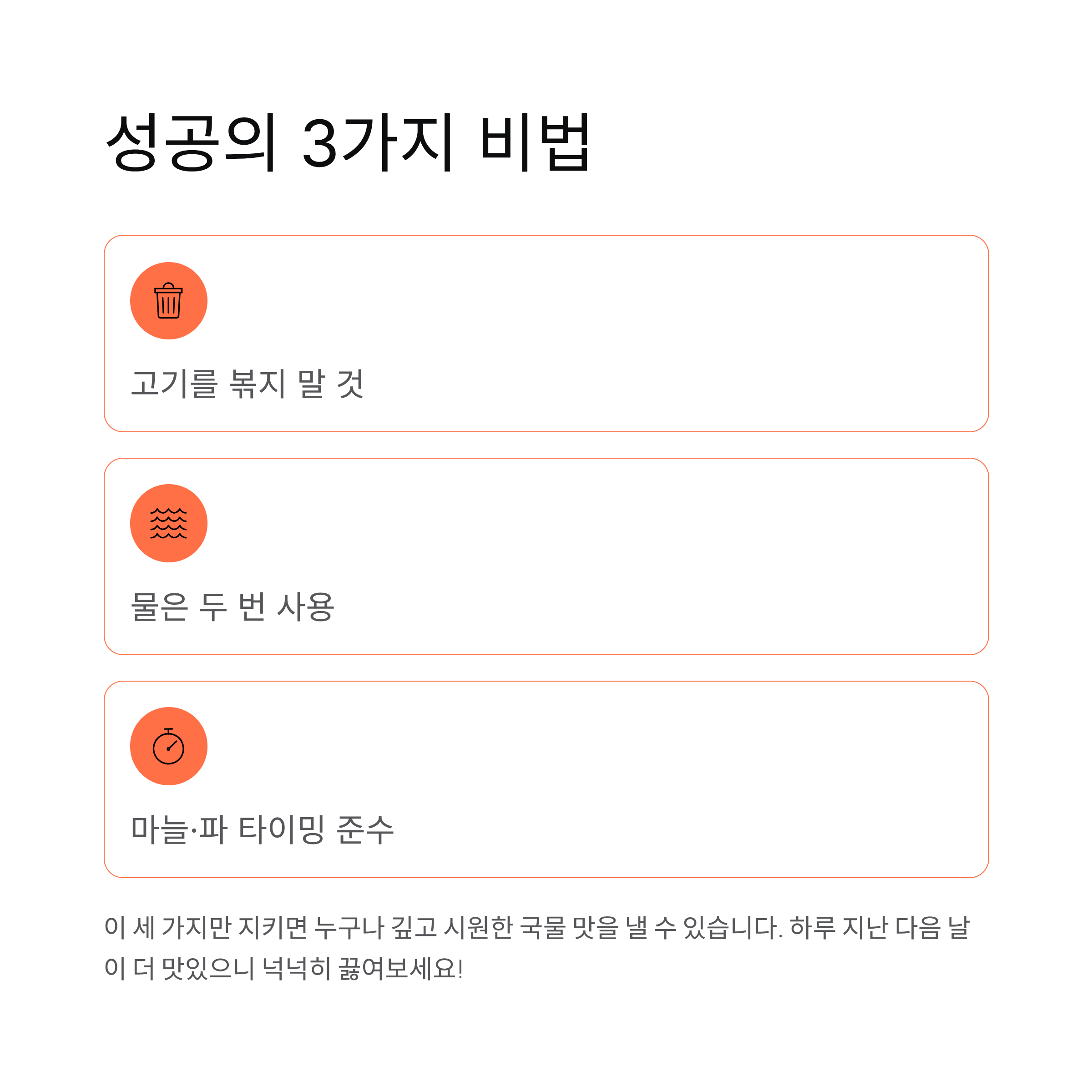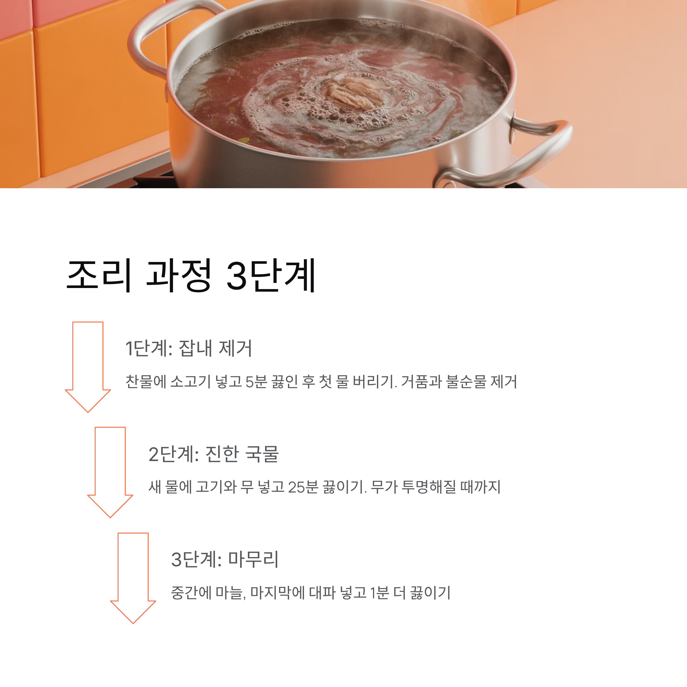 결론적으로 소고기무국의 황금 비법은 단순합니다. 고기를 볶지 말고, 물은 두 번 사용하며, 마늘과 파의 타이밍을 지킨다. 이 세 가지만 정확히 기억하면 누구든 깊고 시원한 국물 맛을 낼 수 있습니다. 오늘 저녁, 이 레시피로 식탁에 따뜻한 한 그릇의 여유를 올려보세요.