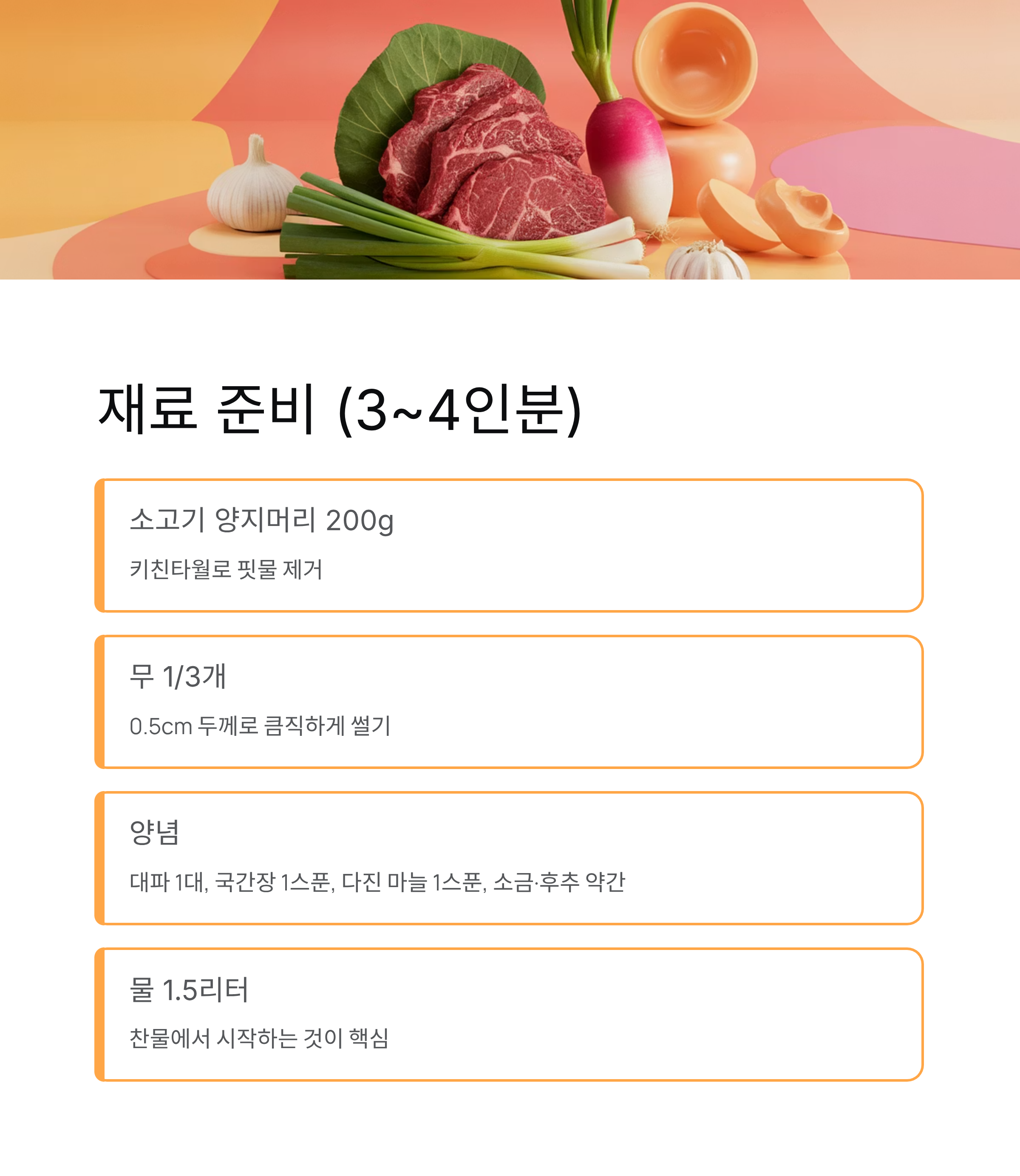 이때 고기를 미리 양념하지 않는 것이 핵심입니다. 양념을 하면 단백질이 응고되어 국물이 탁해질 수 있어요.