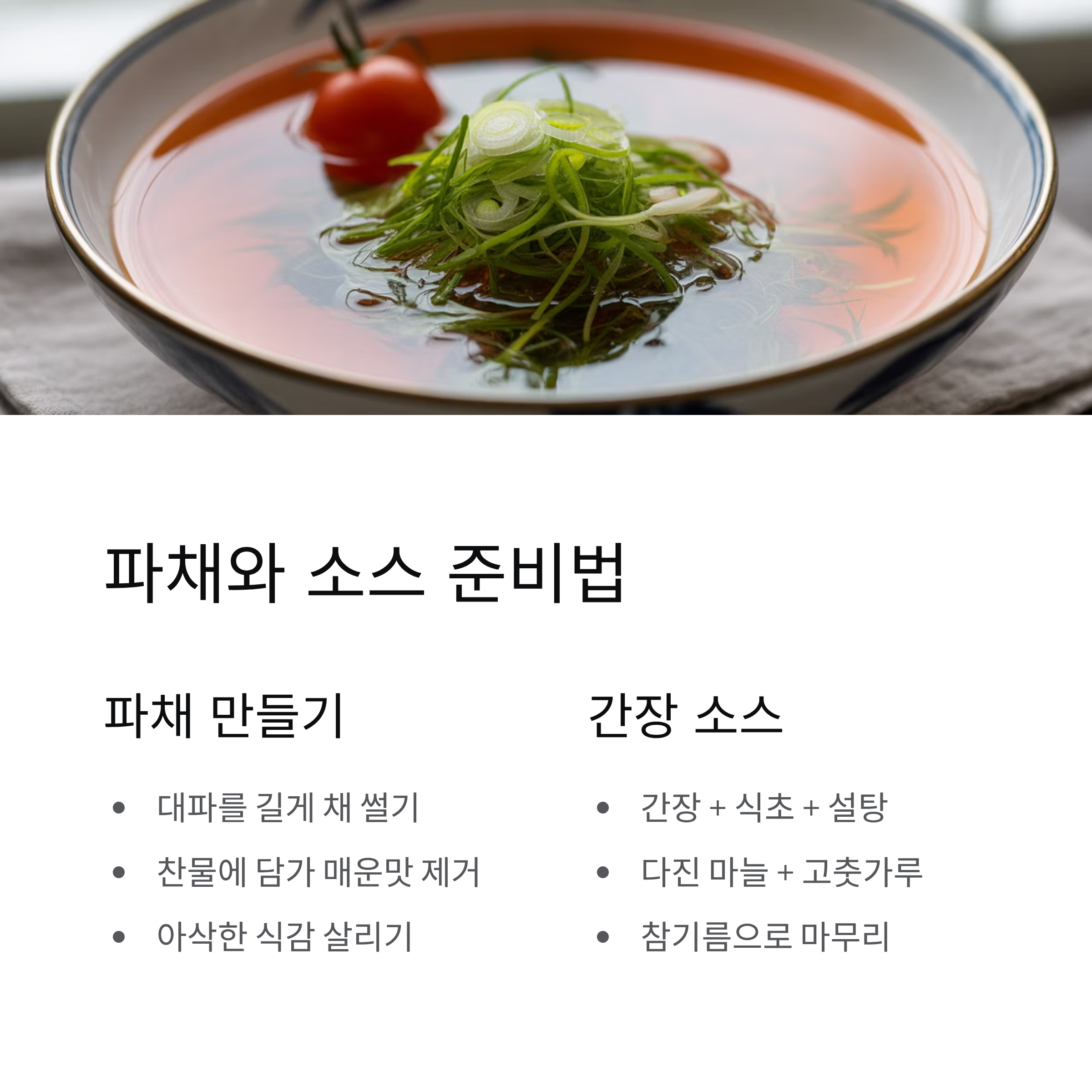 대파를 길게 채 썰어 찬물에 담가 매운맛을 빼 주면 아삭하고 상큼한 맛이 살아납니다.
