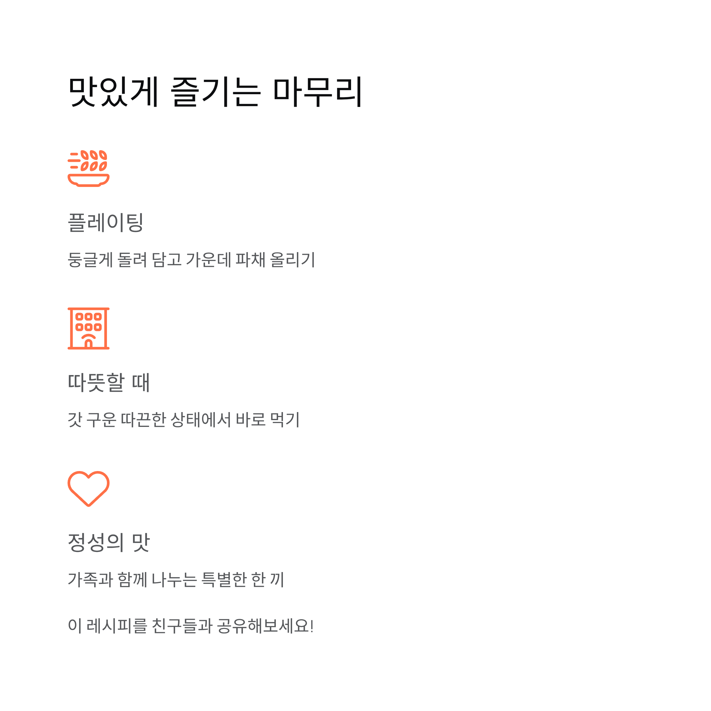 김치나 장아찌 같은 반찬을 곁들이면 느끼함을 잡아주고, 명절 상차림에는 잡채, 나물과 함께 올리면 더욱 조화롭습니다.