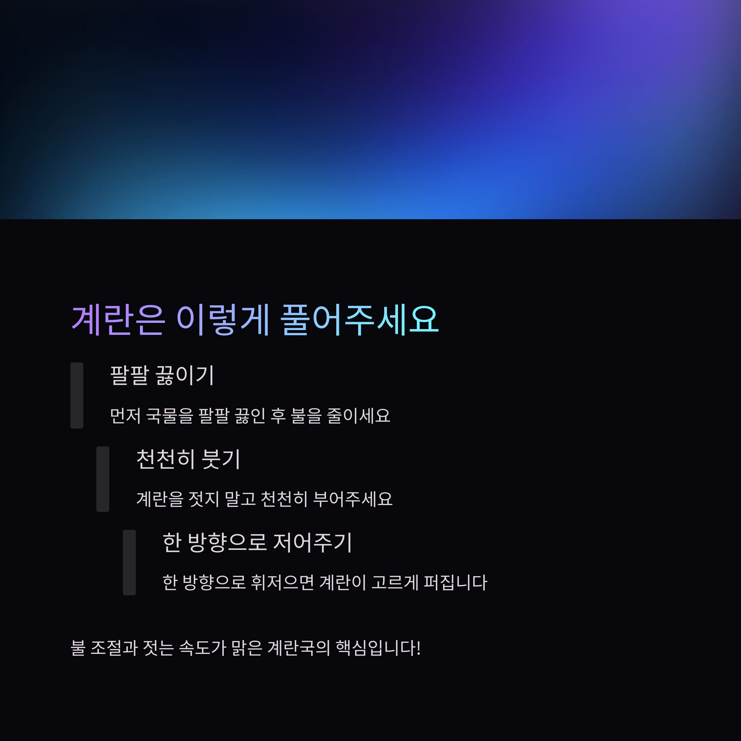 | 계란 푸는 법 | 불 줄이고, 천천히, 젓지 말고 부어주기 |