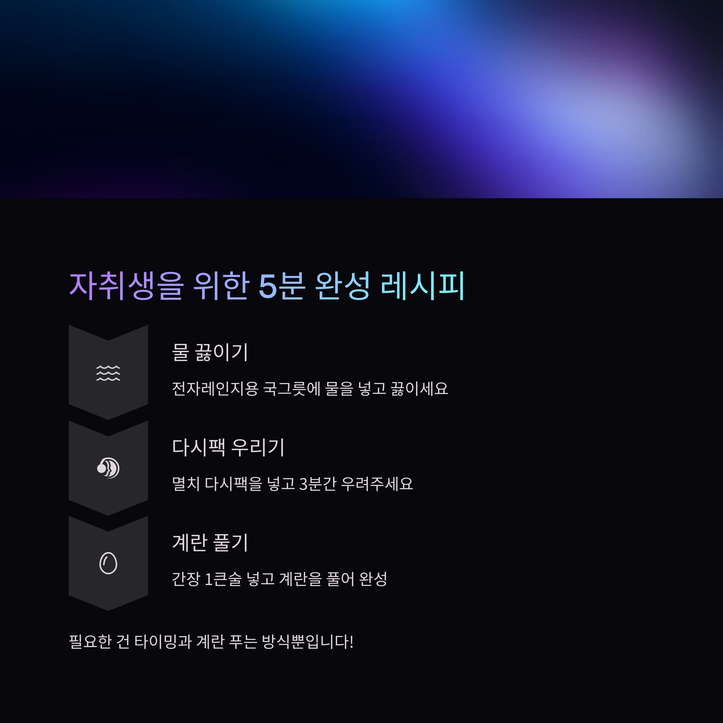 이럴 땐 물 + 멸치 다시팩 + 간장 + 계란만 있어도 충분합니다.