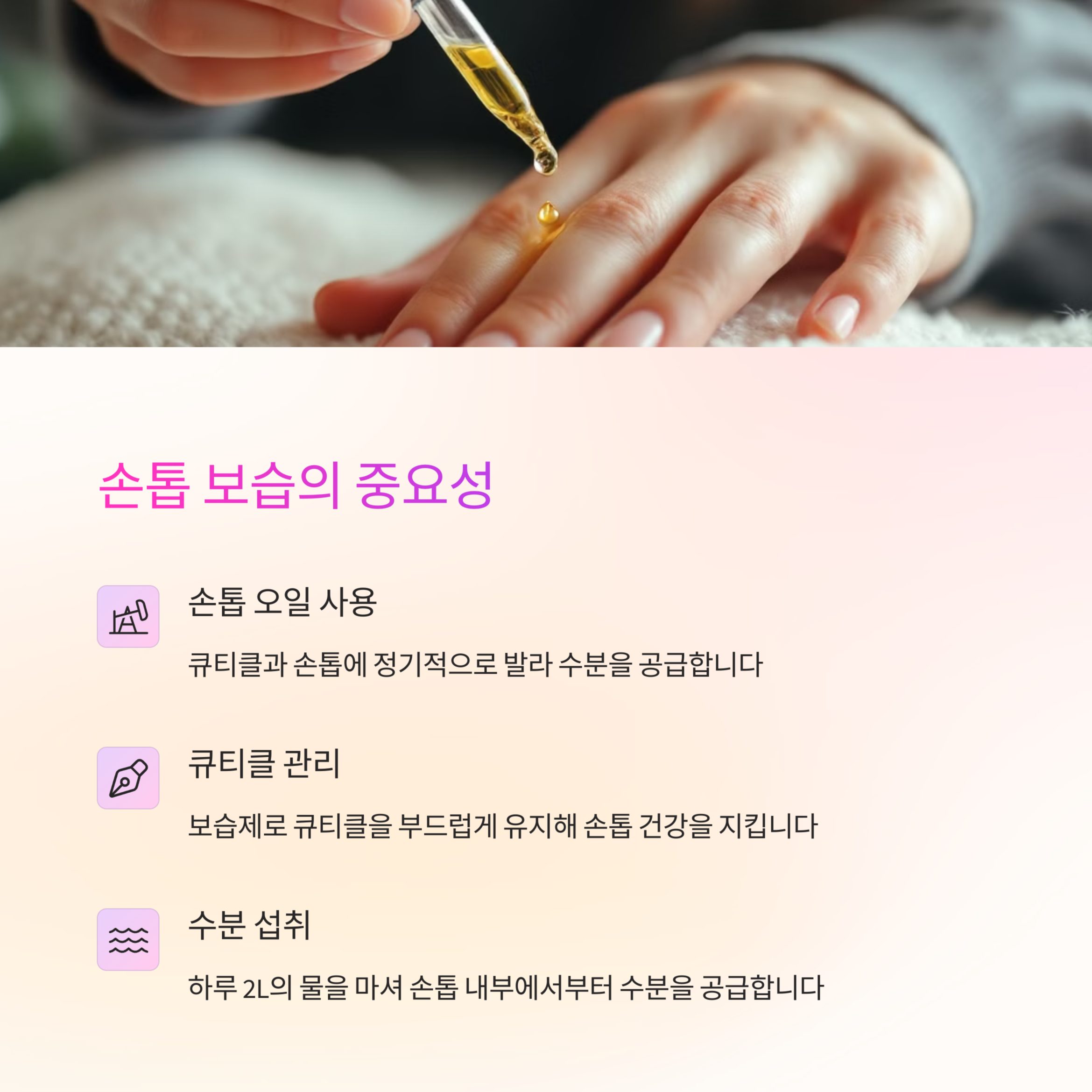 단백질, 비타민 B, 철분 섭취 | 손톱 오일, 크림, 젤 보습제 사용 | 젤네일 휴식, 일자 손톱 다듬기, 자극 피하기 |