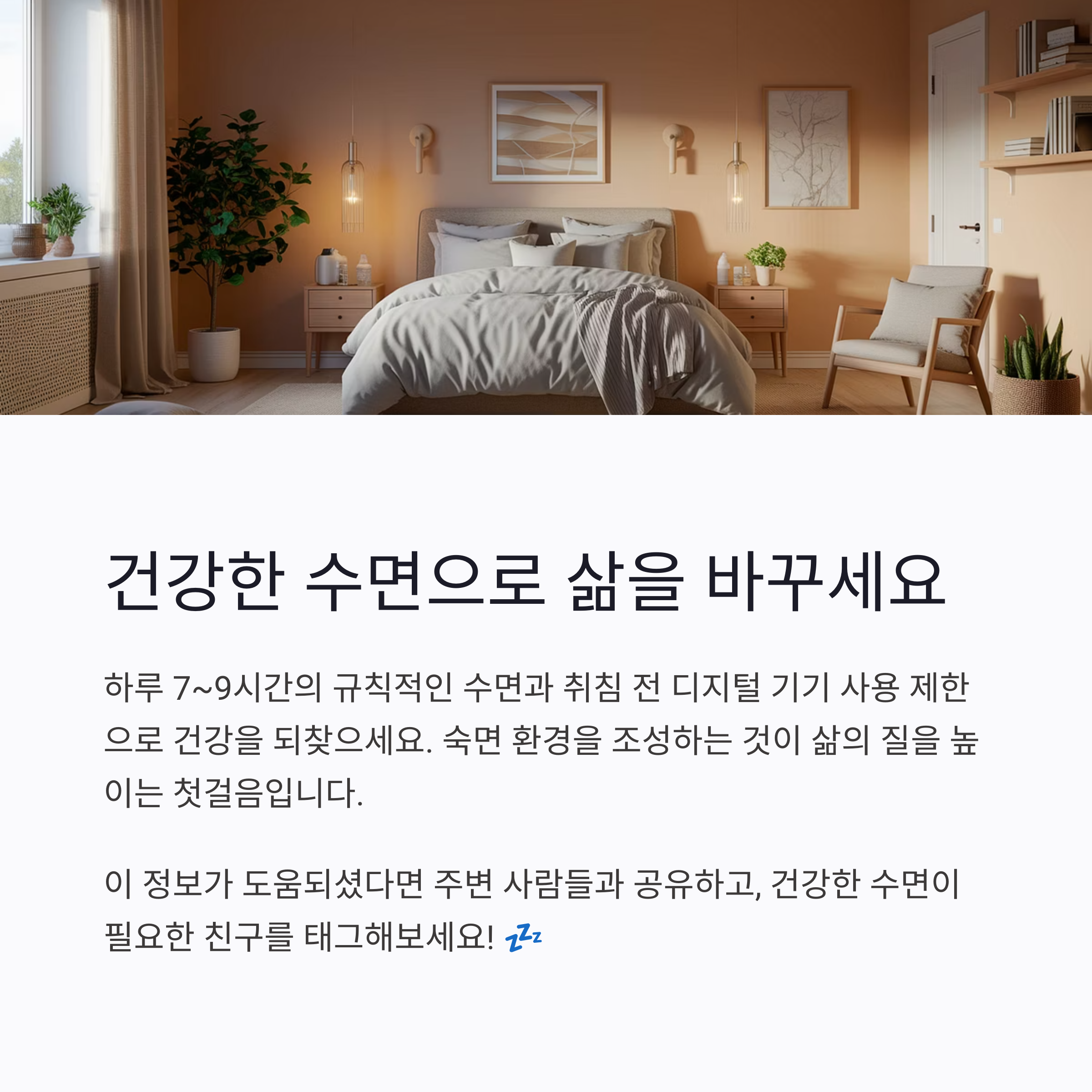 건강한 삶을 위한 필수 조건 중 하나는 충분한 수면입니다. 성인은 최소 하루 7시간 이상 자는 것이 권장되며, 일정한 수면 패턴을 유지하고 잠들기 전 스마트폰 사용을 줄이는 등 생활 습관의 개선이 반드시 필요합니다. 몸과 마음의 회복을 위한 가장 기본적인 노력으로, 오늘부터 수면의 중요성을 실천으로 옮겨보세요.