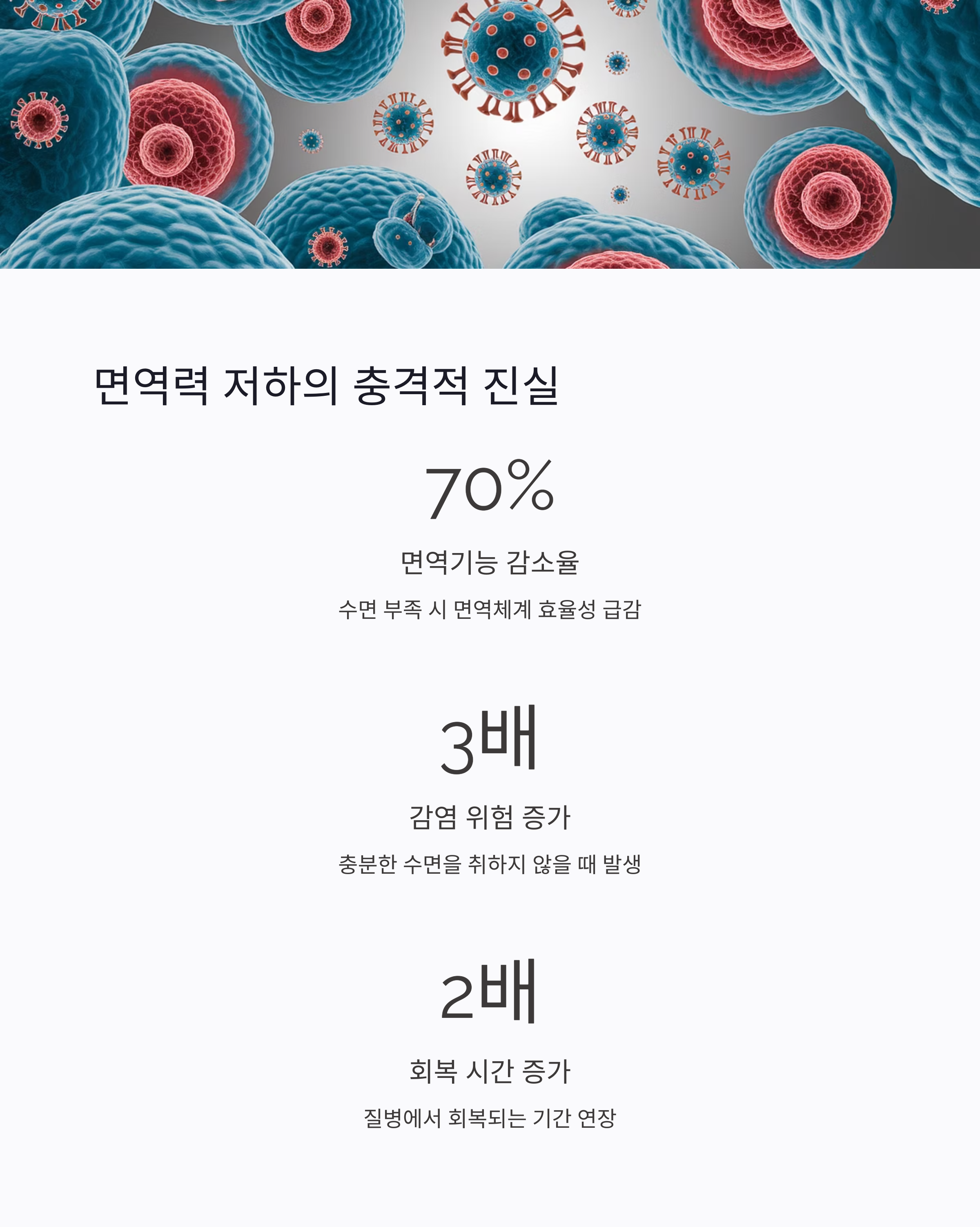 | 면역세포 활성화가 저하되어 감염에 취약해짐 | 피로, 두통, 우울감, 집중력 저하 등 나타남 | 일정한 수면 시간, 저녁 카페인 제한 등 권장 |