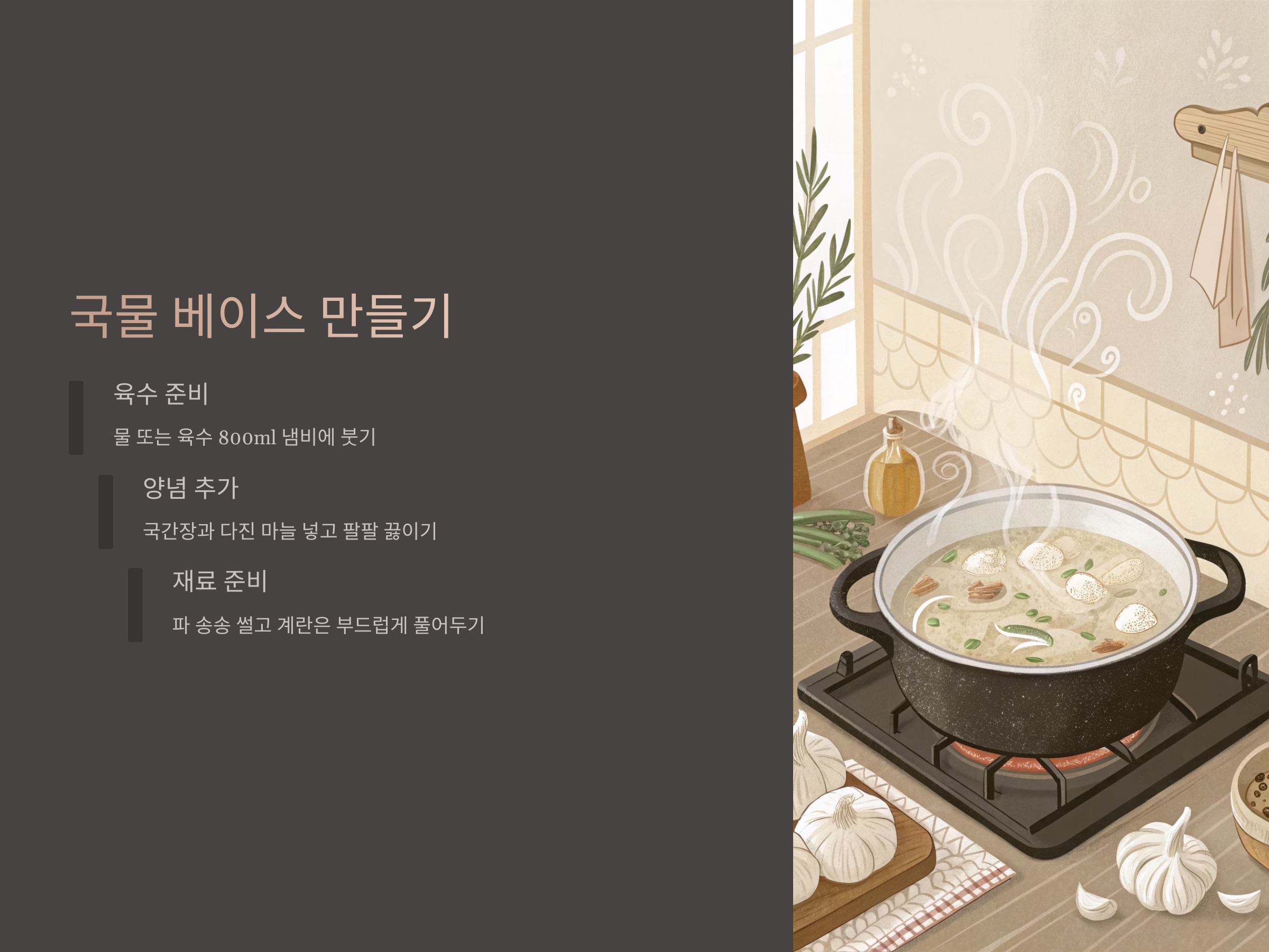 파를 미리 넣으면 향이 퍼지고, 마늘은 뒷맛을 시원하게 정리해줍니다.