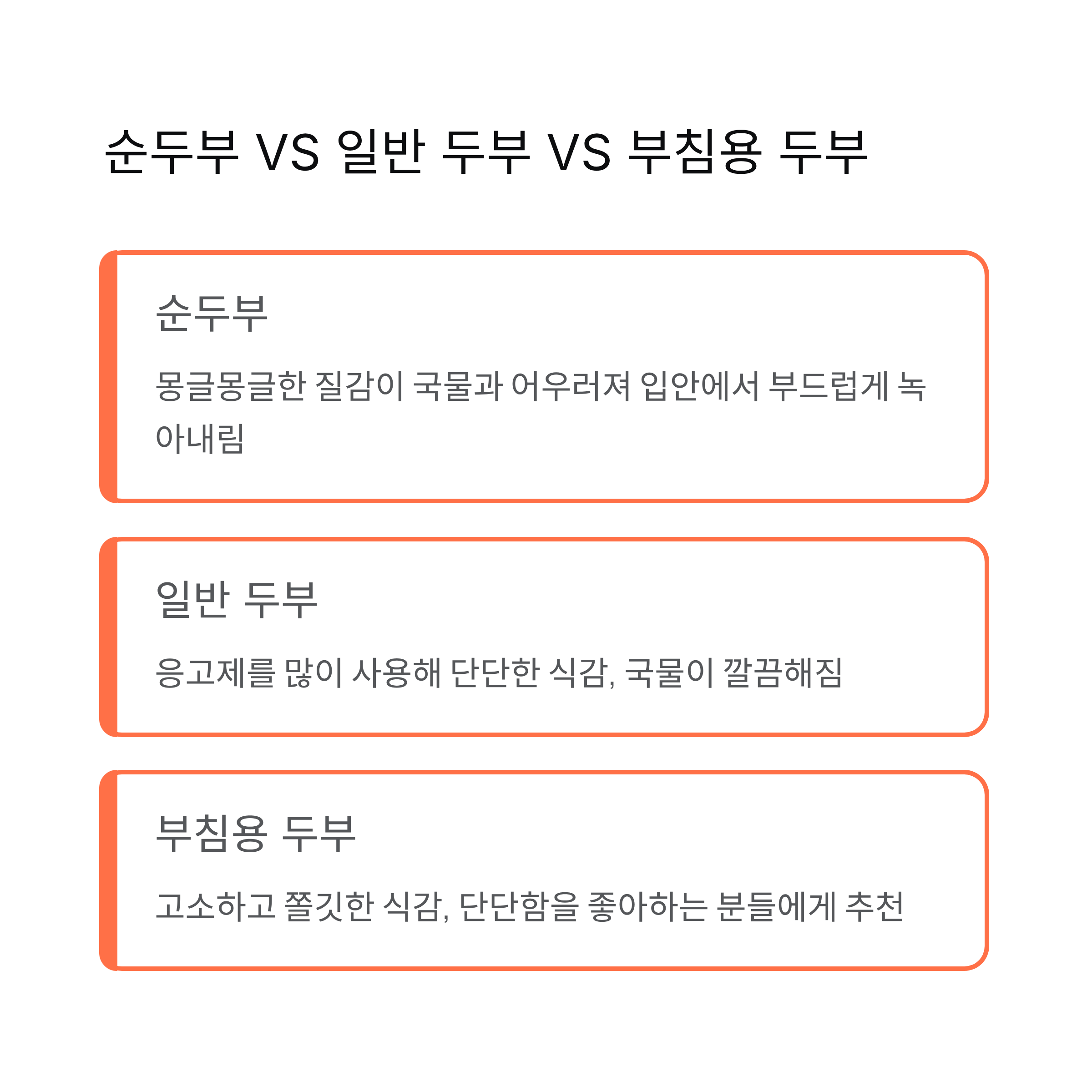 | 일반 두부 | 단단하고 깔끔함 | 된장찌개, 국 요리 |