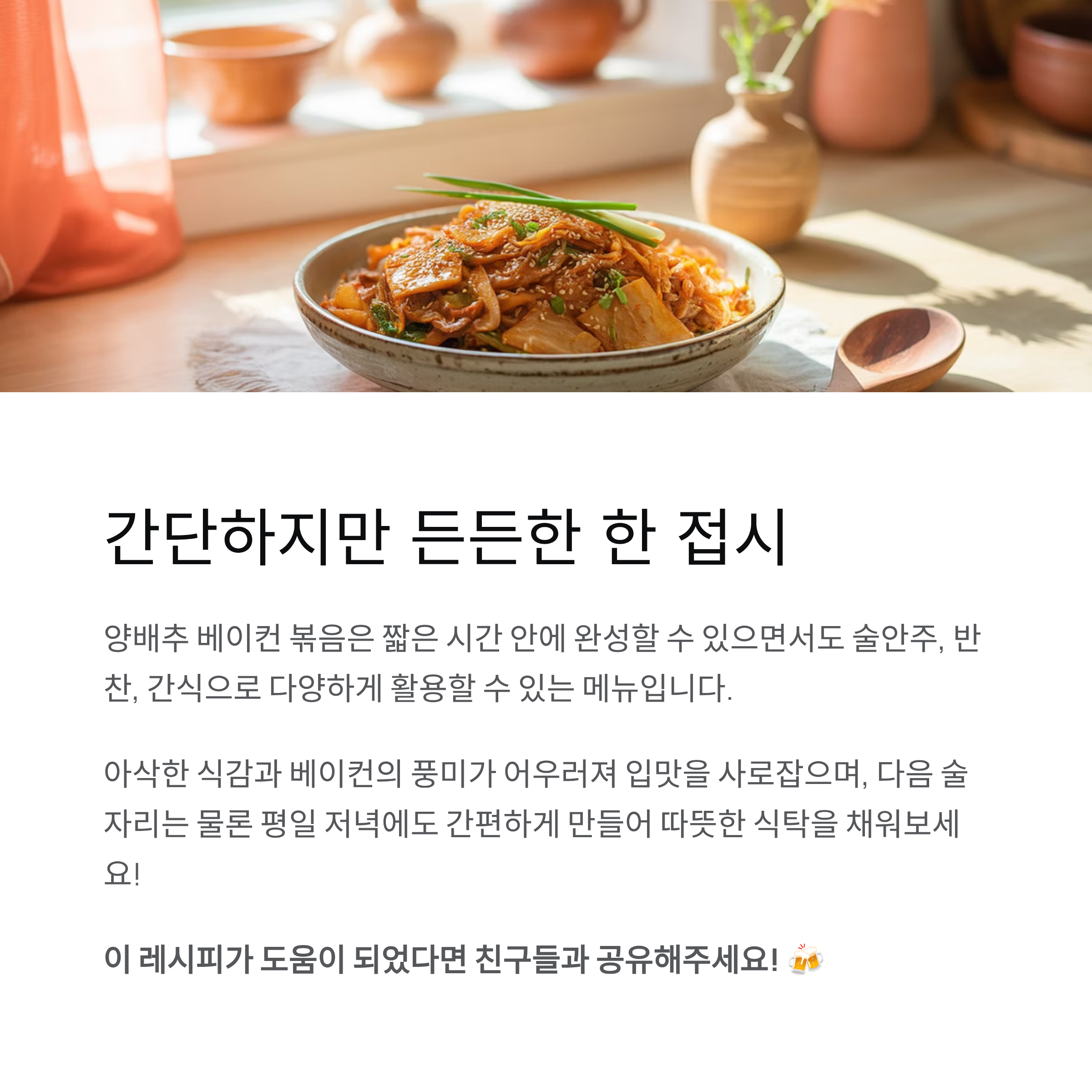 오늘은 간단하면서도 실패 없는 양배추 베이컨 볶음 레시피와 맛있게 즐기는 꿀팁까지 소개해 드립니다.