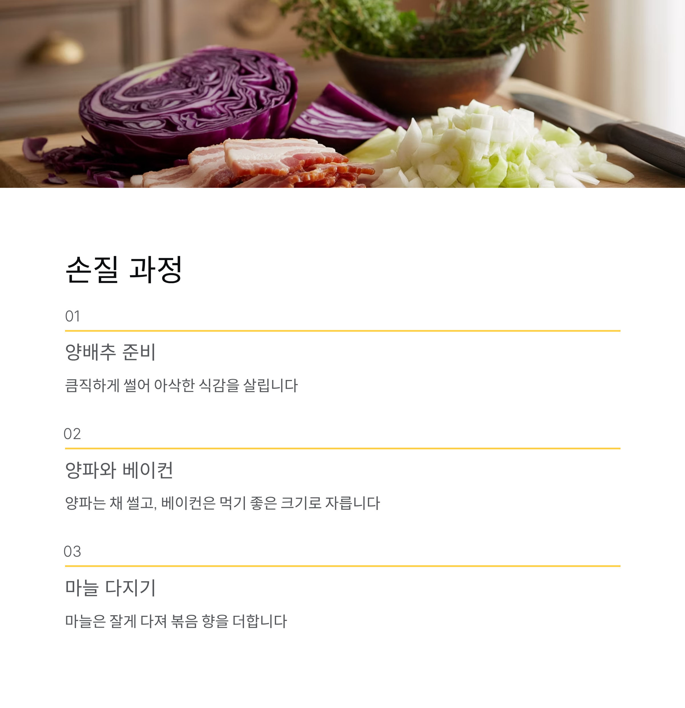 | 손질 | 양배추, 양파, 베이컨 준비 | 큼직하게 썰기 |